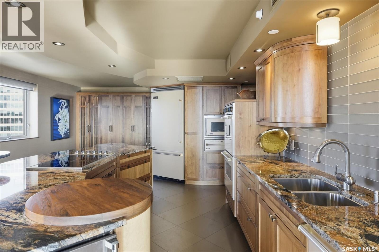 This impressive 1,798 sq. ft. corner unit condo offers stunning river views and exceptional natural light with windows facing east, south, and west. Perfectly positioned along the river, the home provides beautiful panoramic scenery and a bright, open feel throughout the day. The condo was extensively renovated between 2009–2010 creating a truly one-of-a-kind, high-end living space. The custom kitchen is a standout feature, showcasing a Viking appliance package including a built-in refrigerator, induction cooktop, double ovens, warming drawer, convection microwave, and dishwasher. The kitchen also includes custom cabinetry, an island with pendant lighting and integrated power outlets, and an instant hot water dispenser, making it ideal for both everyday living and entertaining. Throughout the home you’ll find commercial-grade vinyl flooring, extensive pot lighting, wall sconces, and upgraded light fixtures, along with a wired in-ceiling speaker system connected to a central media hub. The condo was also pre-wired for electric roller blinds at the windows. The thoughtful design continues with custom cabinetry in the ensuite, walk-in closet, second bathroom, and entrance, including built-in entrance cabinetry with interior lighting. A complete electrical redesign was completed during the renovation, including a new electrical panel and wiring throughout. Additional upgrades include all new windows and a sliding door to the balcony, and a refinished balcony surface for easy cleaning. A rare opportunity to own a fully renovated riverfront corner unit offering exceptional space, premium finishes, and spectacular views. (id:34297)