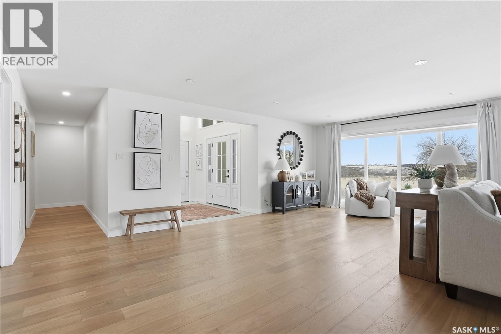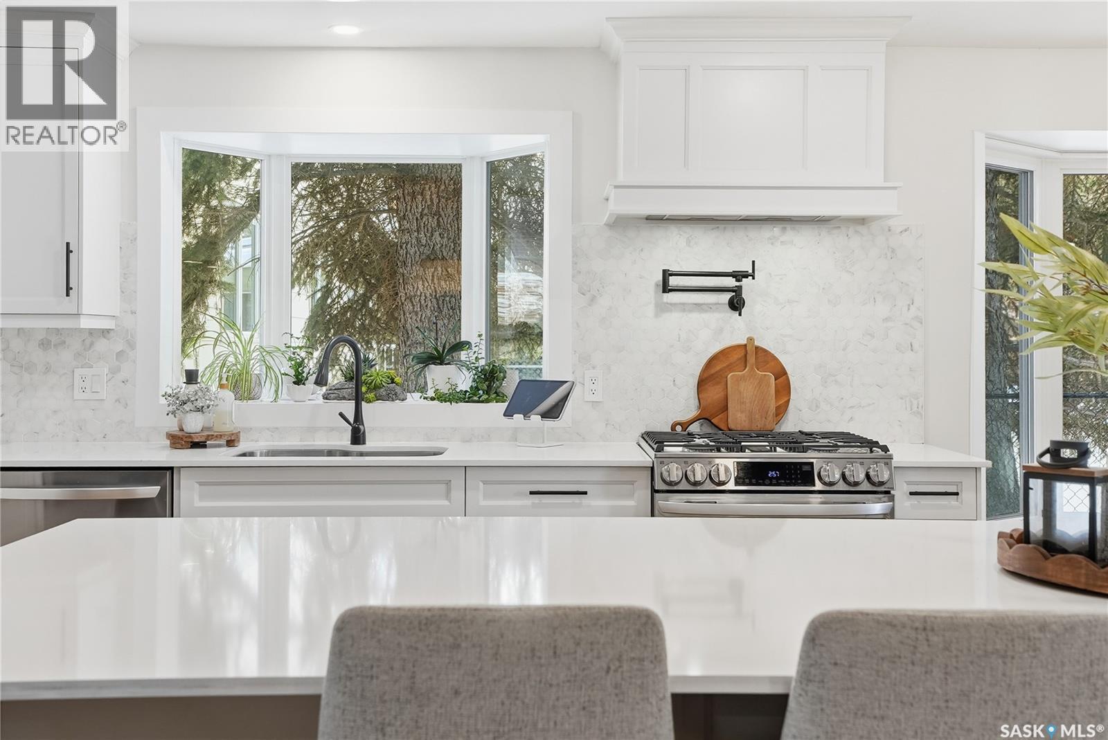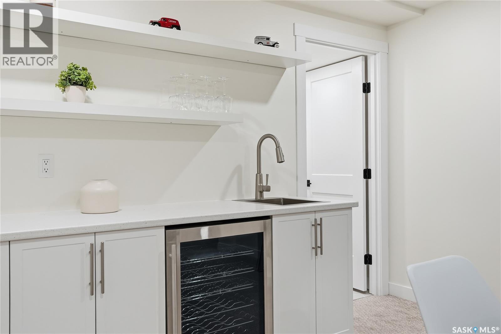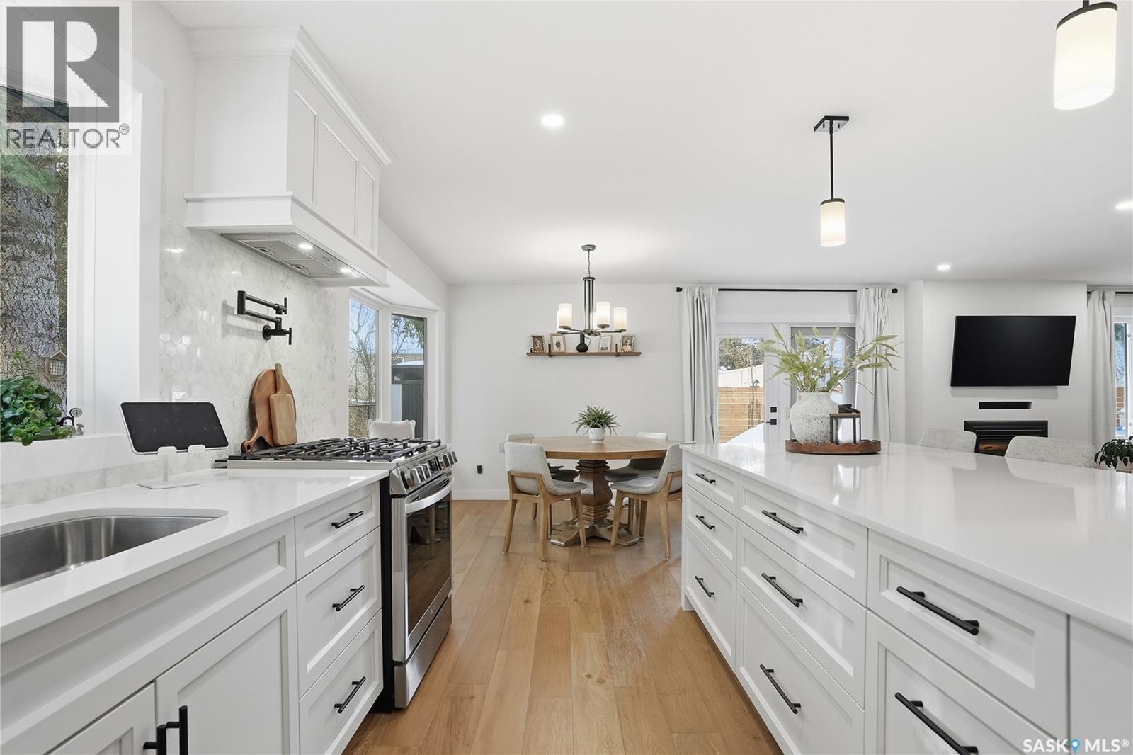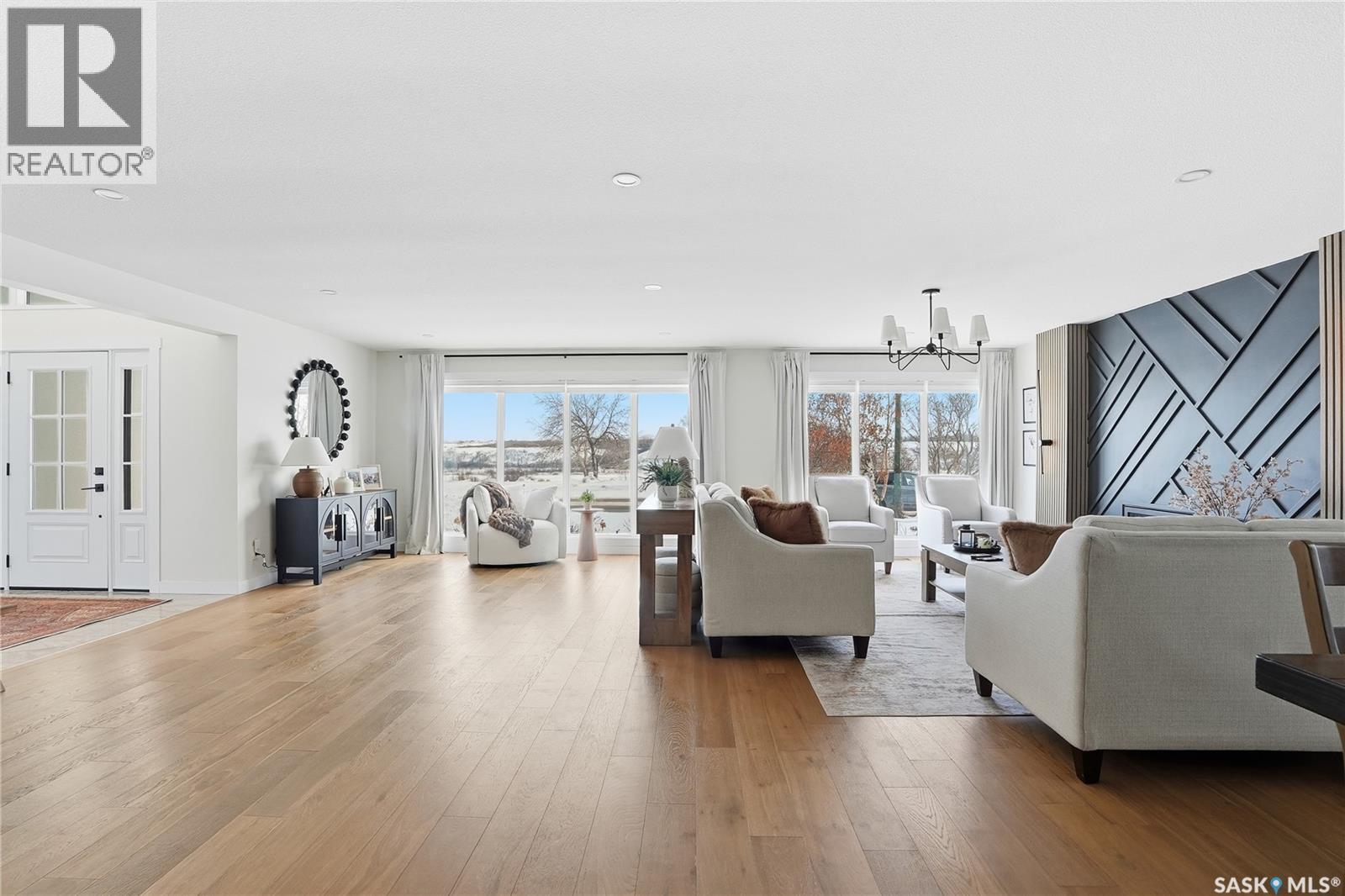 CHECK ON THE VIDEO ABOVE! Timeless style and exceptional craftsmanship define this stunning 2,691 sq. ft. bungalow in prestigious Lawson Heights, offering river views and overlooking Meewasin Trail. Welcome to 115 Whiteswan Drive, where a grand foyer with soaring ceilings creates an inviting first impression. Sun-filled living and dining areas showcase breathtaking views and feature a striking custom warm-toned wood feature wall with a sleek linear gas fireplace, ideal for both everyday living and entertaining. Beautiful new warm-coloured hardwood flooring flows throughout the main floor, enhancing the home’s elegant, cohesive design. A private main-floor office with glass doors is perfect for working from home. The executive kitchen impresses with white cabinetry, an expansive island, quartz countertops, and a fully equipped butler’s pantry with all new stainless steel appliances, including double refrigerators, double ovens, gas stove, beverage fridges, tall wine cooler, and warming oven—designed for hosting and convenience. The breakfast nook features a south-facing window seat, while the adjoining family room opens to outdoor living. The spacious primary bedroom (19’ x 13’) offers a large walk-in closet and a spa-like 5-piece ensuite. Two additional well-proportioned bedrooms share a 5-piece bath, along with rare main-floor storage and extra cabinetry. The newly fully developed lower level provides a wet bar, extra bedroom, bright 3-piece bathroom, gym/exercise space, and generous storage. Mechanical upgrades include a high-efficiency furnace and on-demand water heater. Enjoy breathtaking sunrise views from the front of the home, then unwind in a sun-filled, private backyard retreat featuring a privacy wall, stamped concrete patio, stunning brick fireplace, tranquil water fountain, lush landscaping, brand new fencing, and a shed—a truly secluded oasis. (id:34297)