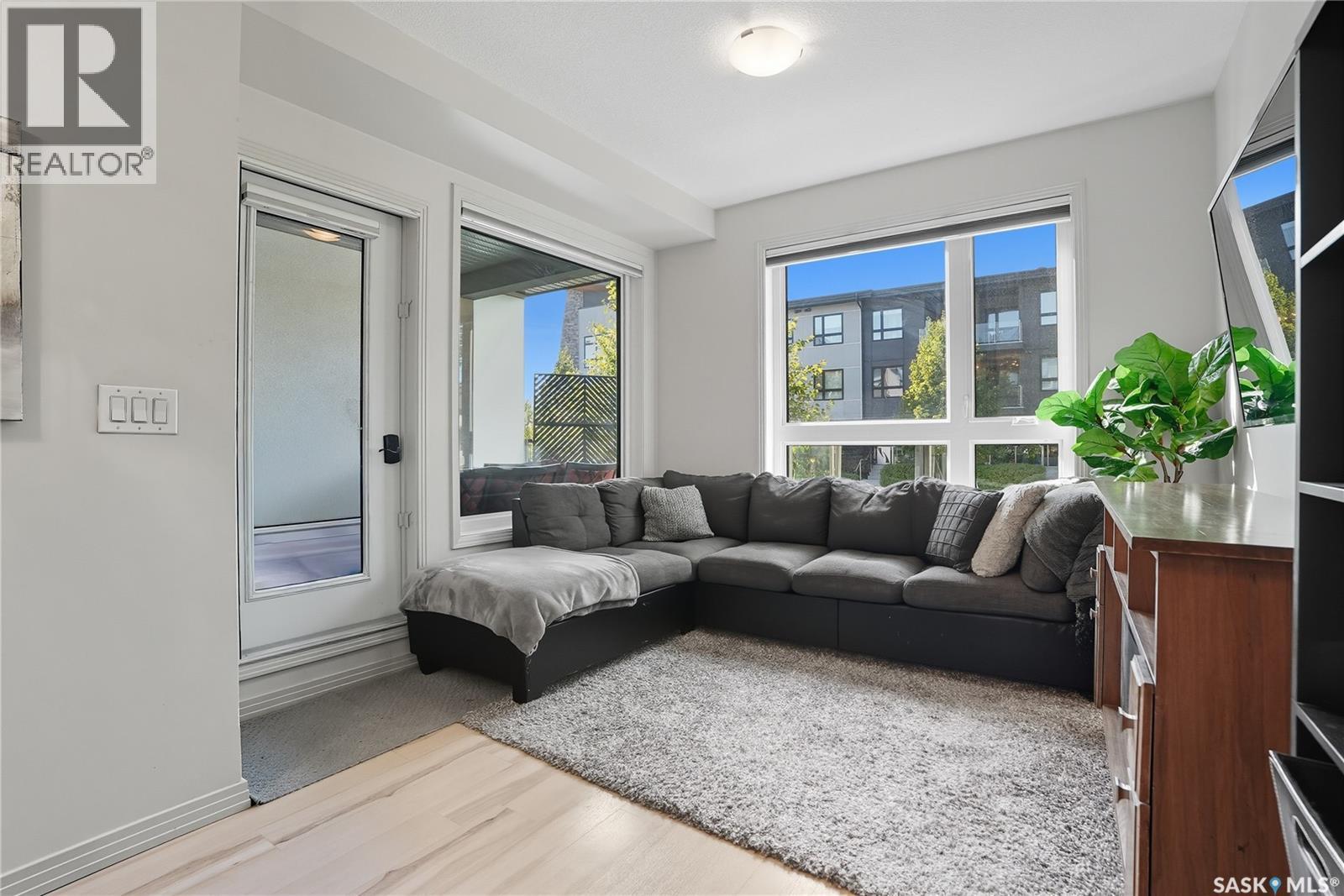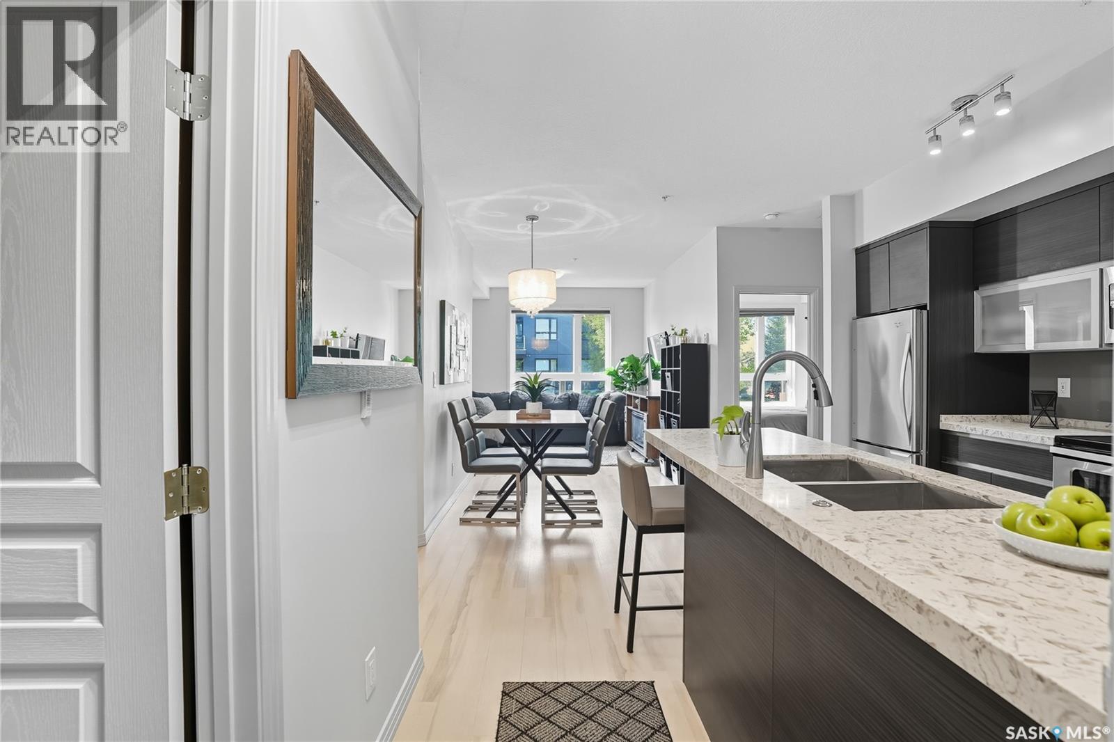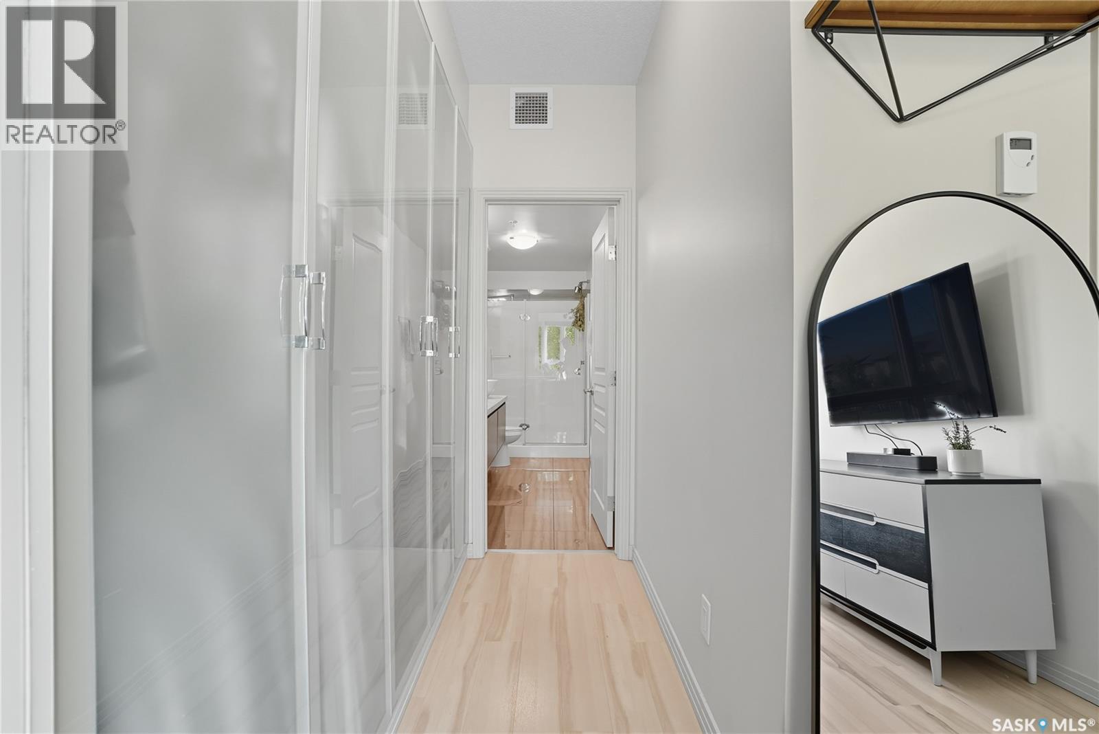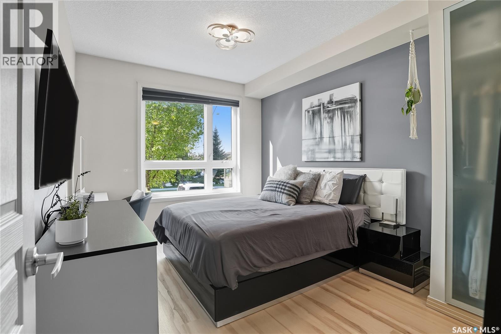 $425 MonthlyWelcome to 223 Evergreen Square #120 – a beautifully maintained 900 sq. ft. ground-level condo located in the heart of Evergreen, Saskatoon. This immaculate 2-bedroom, 2-bathroom unit stands out with its rare private entrance from the street, offering added convenience, privacy, and a townhouse-like feel that most units in the building don’t have. Inside, you'll find a bright and modern living space featuring in-floor heating, central air conditioning, and elegant quartz countertops throughout. The primary bedroom includes a tiled ensuite with a dual vanity, adding a touch of luxury to your daily routine. Enjoy the outdoors from your oversized terrace, complete with glass railings and durable, foot-friendly vinyl decking—perfect for entertaining or relaxing with views of Amphitheatre Park right across the street. This home also comes with an underground parking stall and a private storage unit located just beside it for added convenience. Residents of the building enjoy access to a yoga room, games room, and a pet-friendly “Doggy Spa” wash station, making it ideal for both active lifestyles and pet owners. Located close to public transit, walking paths, and local amenities, this unit offers a perfect balance of comfort, style, and accessibility. (id:34297)