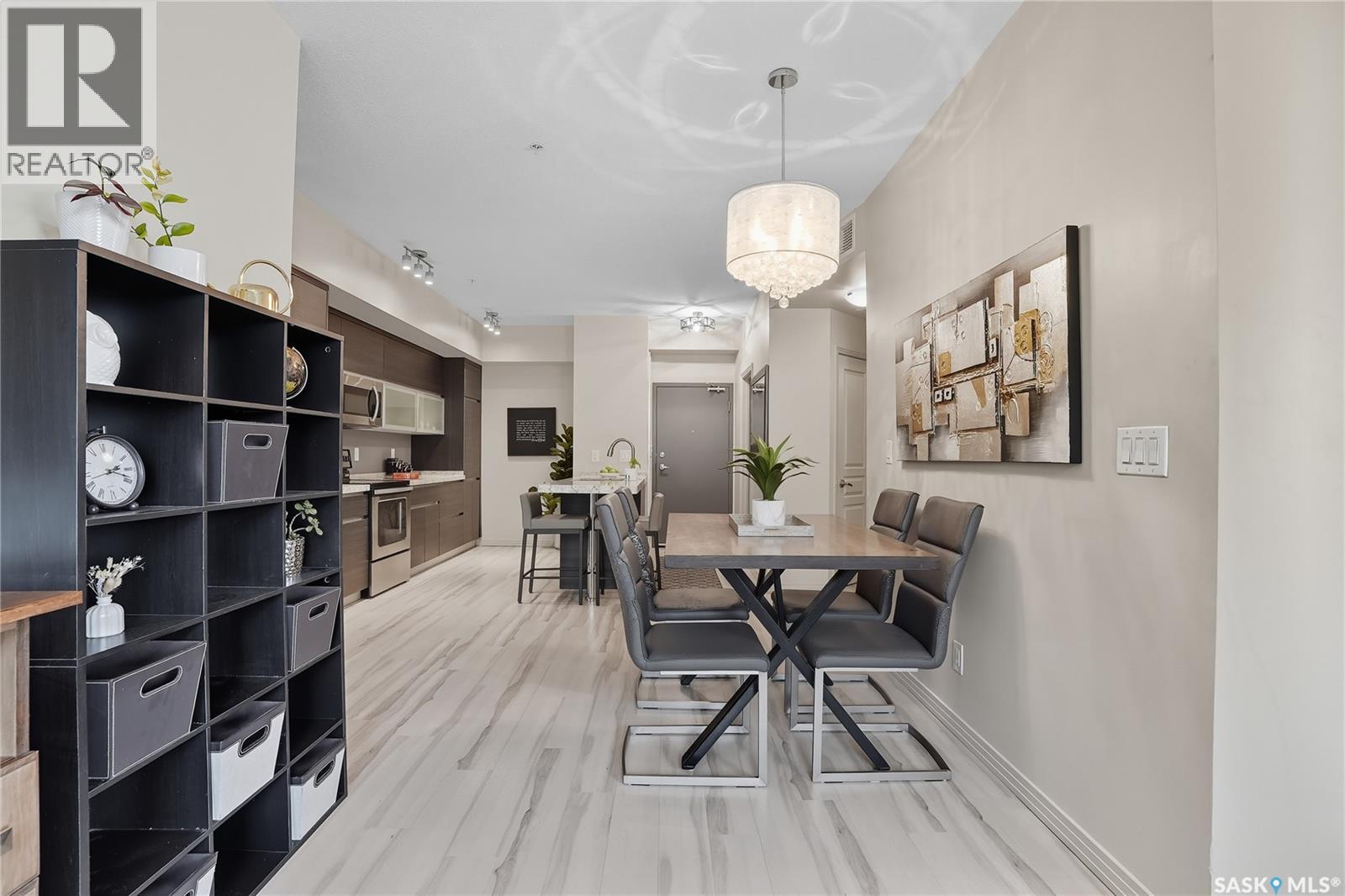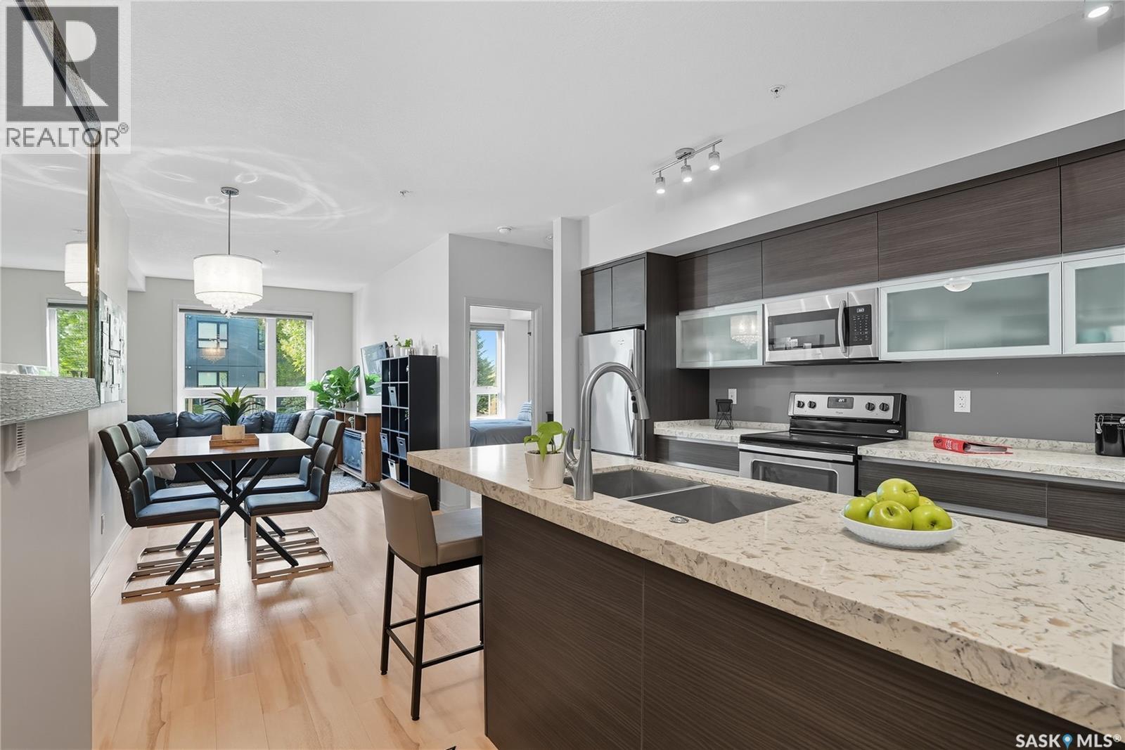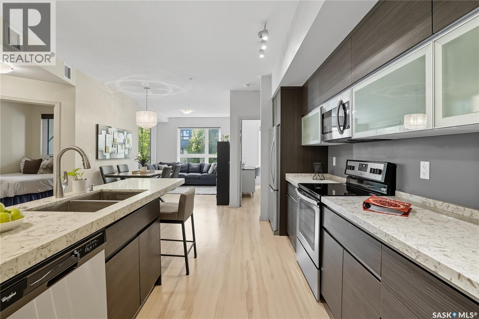 $425 MonthlyWelcome to 223 Evergreen Square #120 – a beautifully maintained 900 sq. ft. ground-level condo located in the heart of Evergreen, Saskatoon. This immaculate 2-bedroom, 2-bathroom unit stands out with its rare private entrance from the street, offering added convenience, privacy, and a townhouse-like feel that most units in the building don’t have. Inside, you'll find a bright and modern living space featuring in-floor heating, central air conditioning, and elegant quartz countertops throughout. The primary bedroom includes a tiled ensuite with a dual vanity, adding a touch of luxury to your daily routine. Enjoy the outdoors from your oversized terrace, complete with glass railings and durable, foot-friendly vinyl decking—perfect for entertaining or relaxing with views of Amphitheatre Park right across the street. This home also comes with an underground parking stall and a private storage unit located just beside it for added convenience. Residents of the building enjoy access to a yoga room, games room, and a pet-friendly “Doggy Spa” wash station, making it ideal for both active lifestyles and pet owners. Located close to public transit, walking paths, and local amenities, this unit offers a perfect balance of comfort, style, and accessibility. (id:34297)