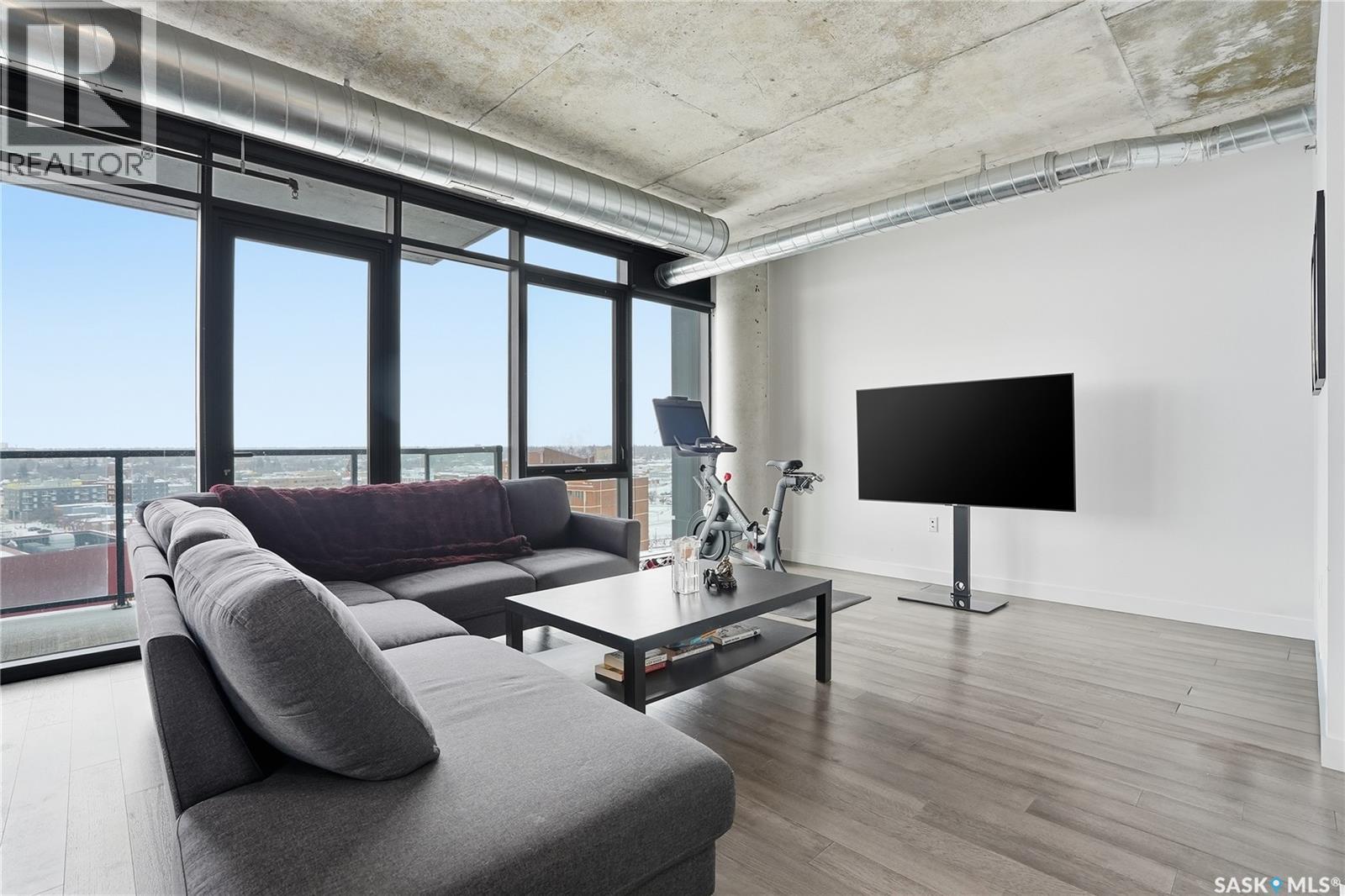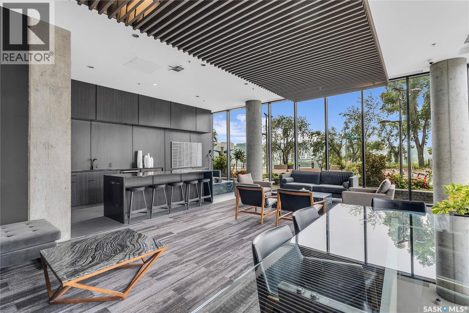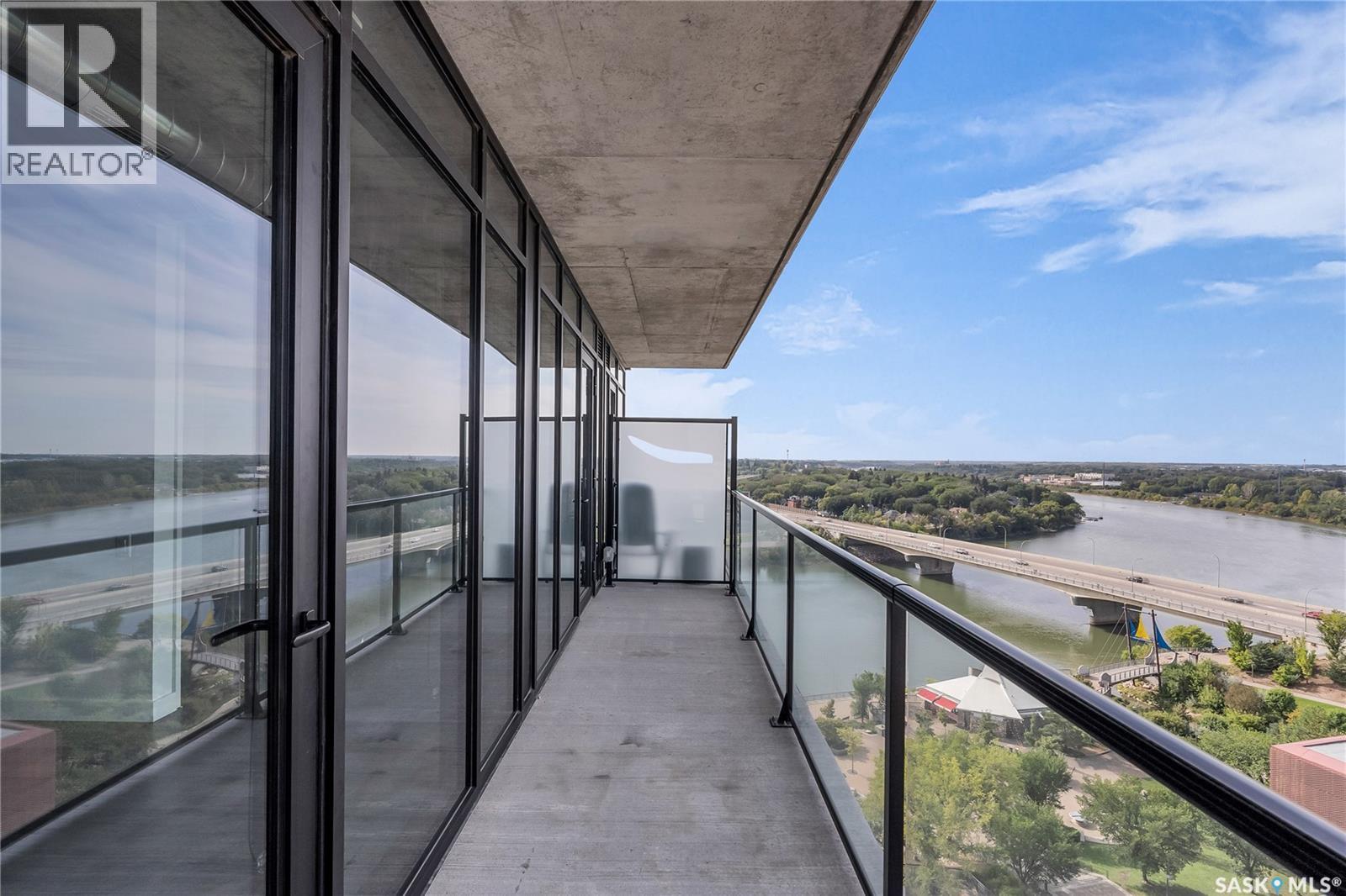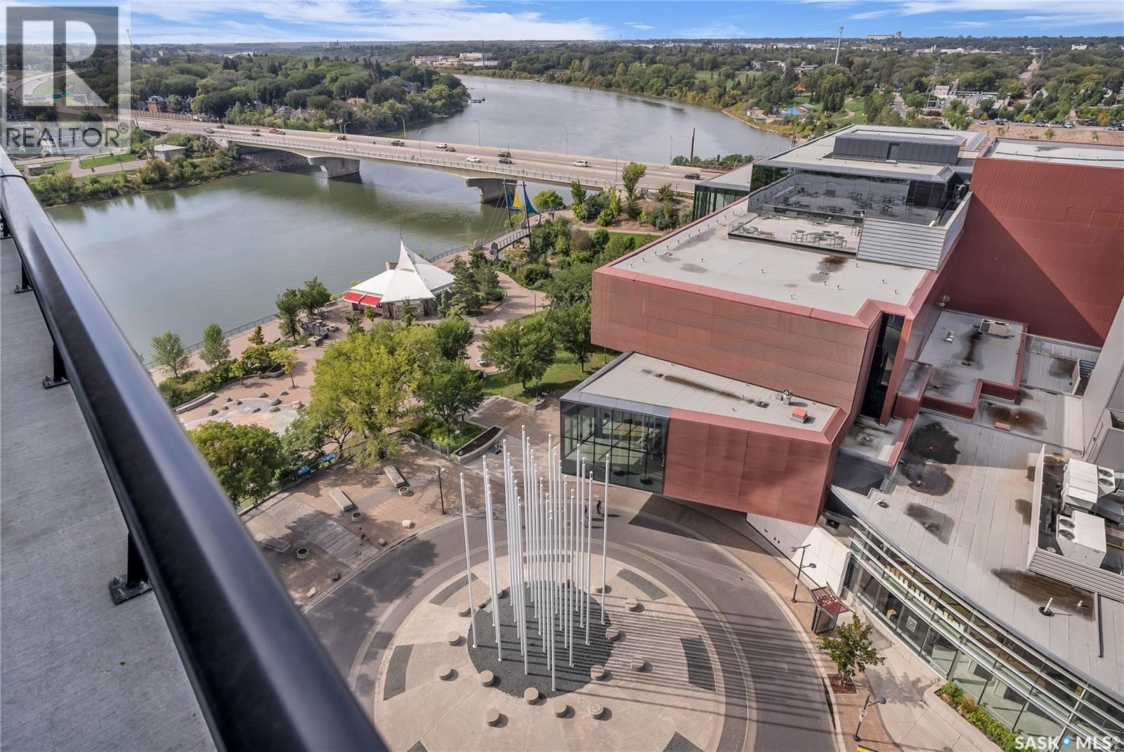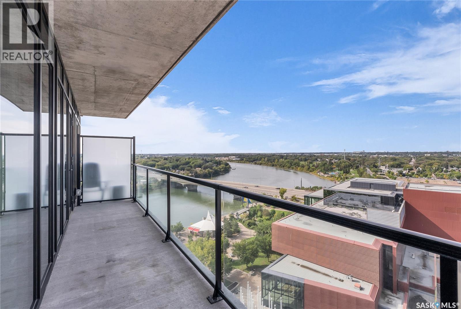 Stunning 13th floor unit at No. 1 River Landing, featuring an expansive view of Saskatoon's downtown, River Landing Park and the South Saskatchewan River. Great layout with 9 ft concrete ceilings, kitchen with quartz counters and stainless steel appliances, 2 bedrooms + den and two bathrooms. Primary bedroom has direct access to the balcony and features a walk-thru closet open to your ensuite with a tiled shower. Second bedroom has a large closet and sliding door entry. Laundry (new washer & dryer!) and additional bathroom are tucked away from the main living space. The floor to ceiling windows run along the whole west side of the unit in the primary Bedroom and spacious living room. This home has central air conditioning, underground parking, storage space, gym and amenities room with pool table and kitchenette. Located just steps away from the river, Remai Modern, many local restaurants, the movie theatre and Midtown Mall. Easily access all downtown amenities and Circle Drive ensuring you're well-connected. (id:34297)