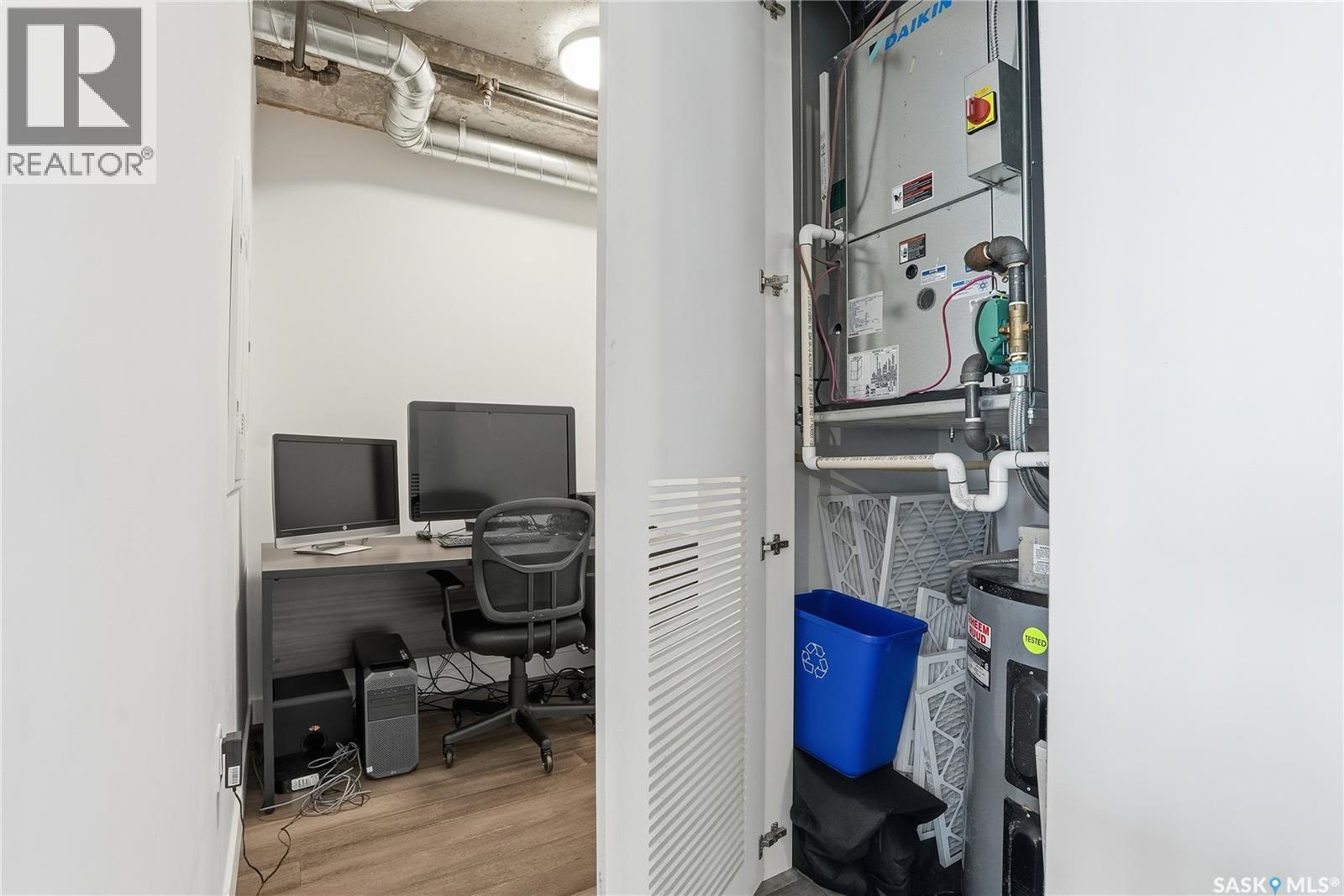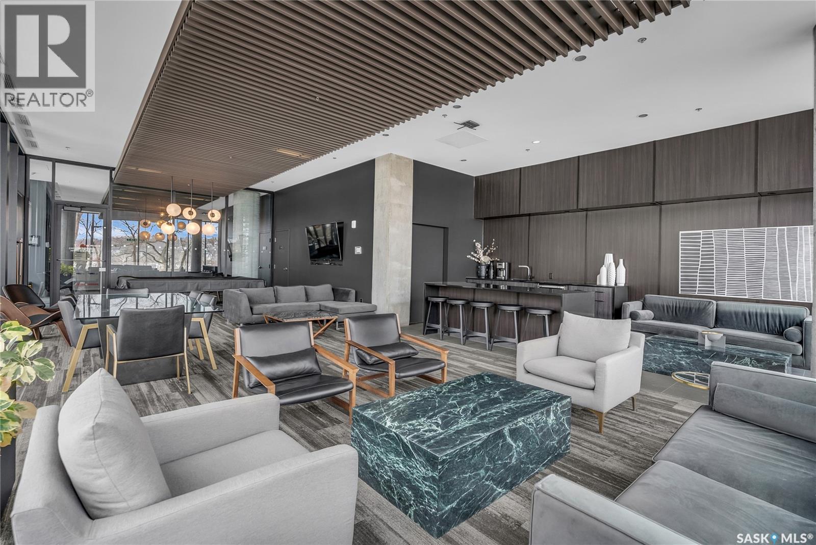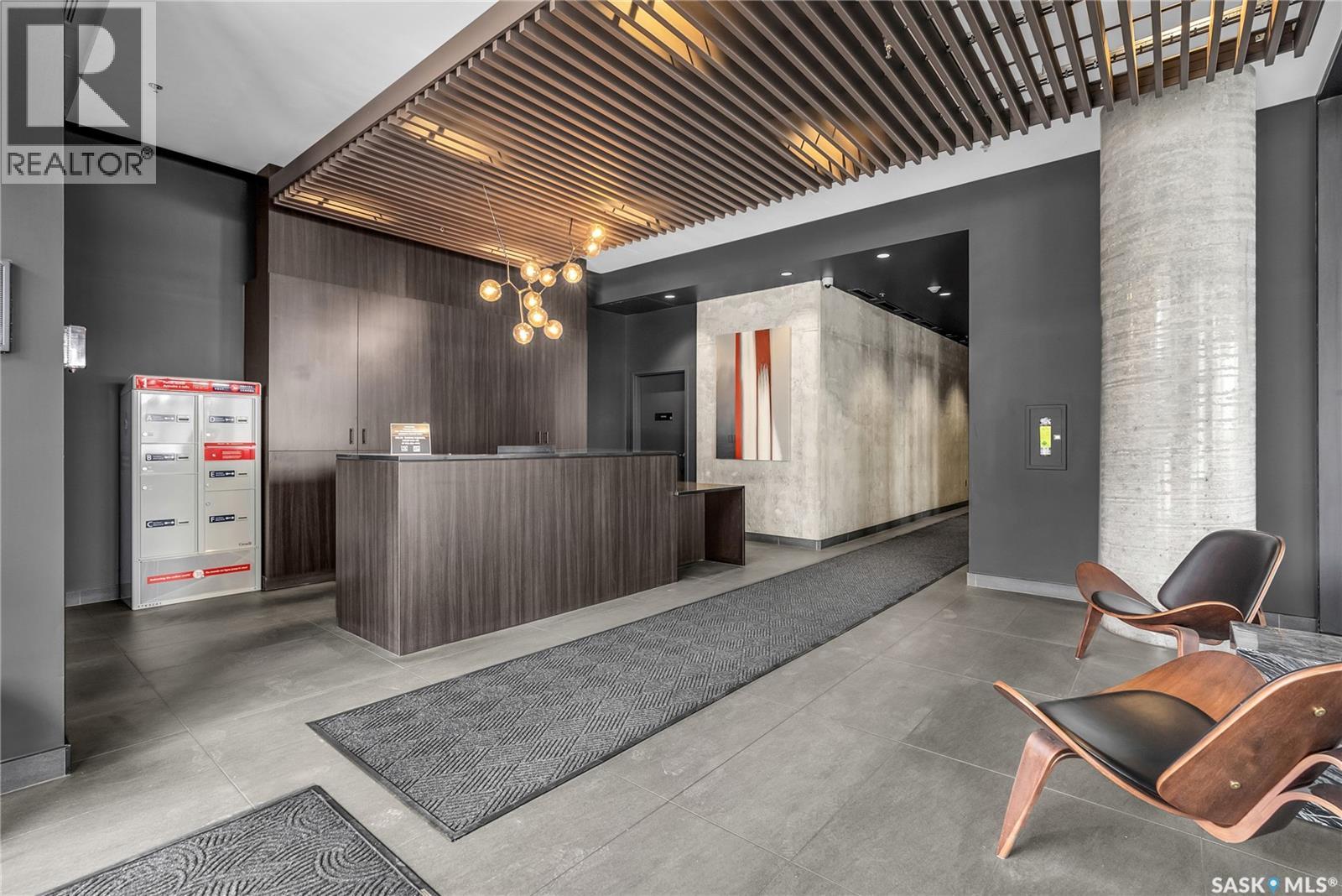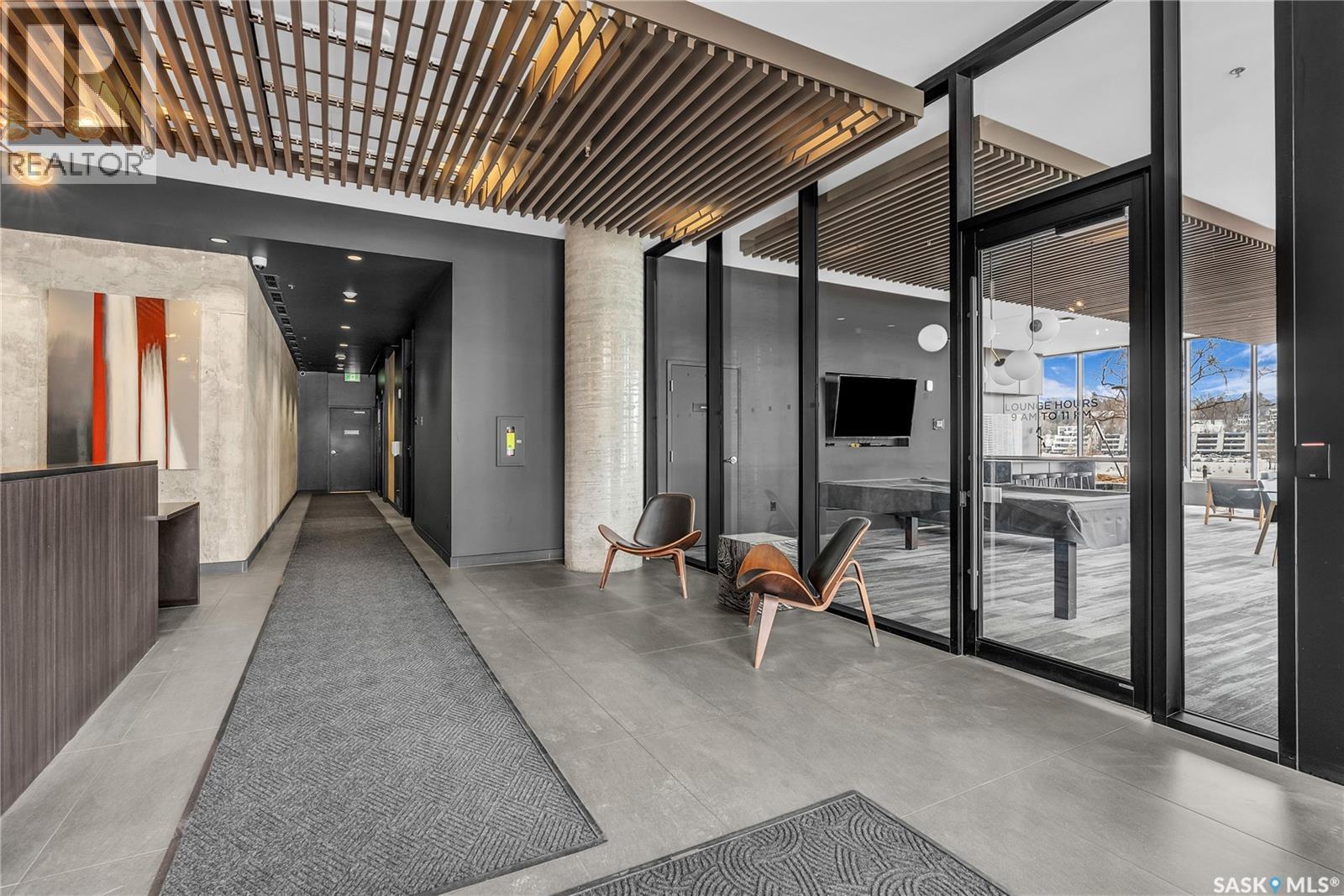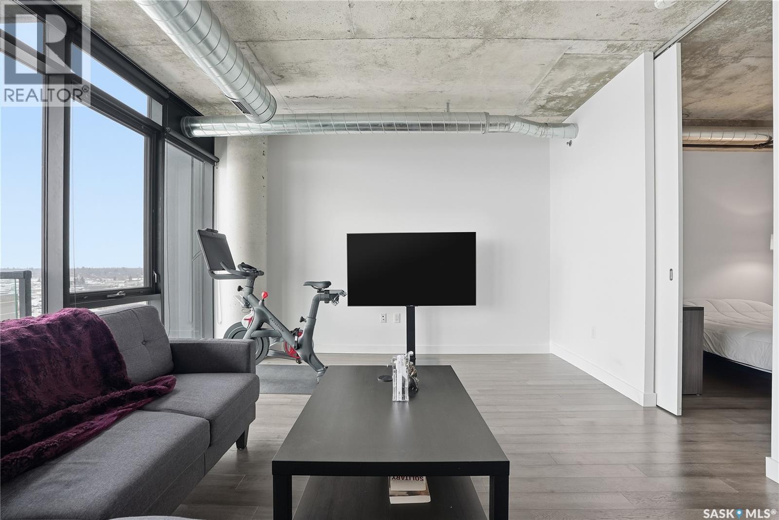 Stunning 13th floor unit at No. 1 River Landing, featuring an expansive view of Saskatoon's downtown, River Landing Park and the South Saskatchewan River. Great layout with 9 ft concrete ceilings, kitchen with quartz counters and stainless steel appliances, 2 bedrooms + den and two bathrooms. Primary bedroom has direct access to the balcony and features a walk-thru closet open to your ensuite with a tiled shower. Second bedroom has a large closet and sliding door entry. Laundry (new washer & dryer!) and additional bathroom are tucked away from the main living space. The floor to ceiling windows run along the whole west side of the unit in the primary Bedroom and spacious living room. This home has central air conditioning, underground parking, storage space, gym and amenities room with pool table and kitchenette. Located just steps away from the river, Remai Modern, many local restaurants, the movie theatre and Midtown Mall. Easily access all downtown amenities and Circle Drive ensuring you're well-connected. (id:34297)