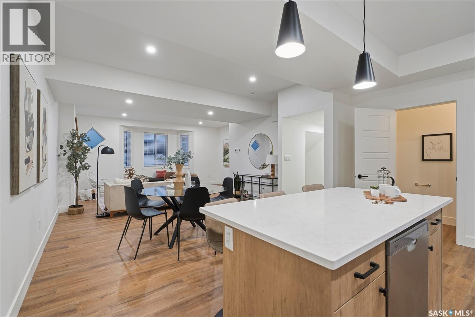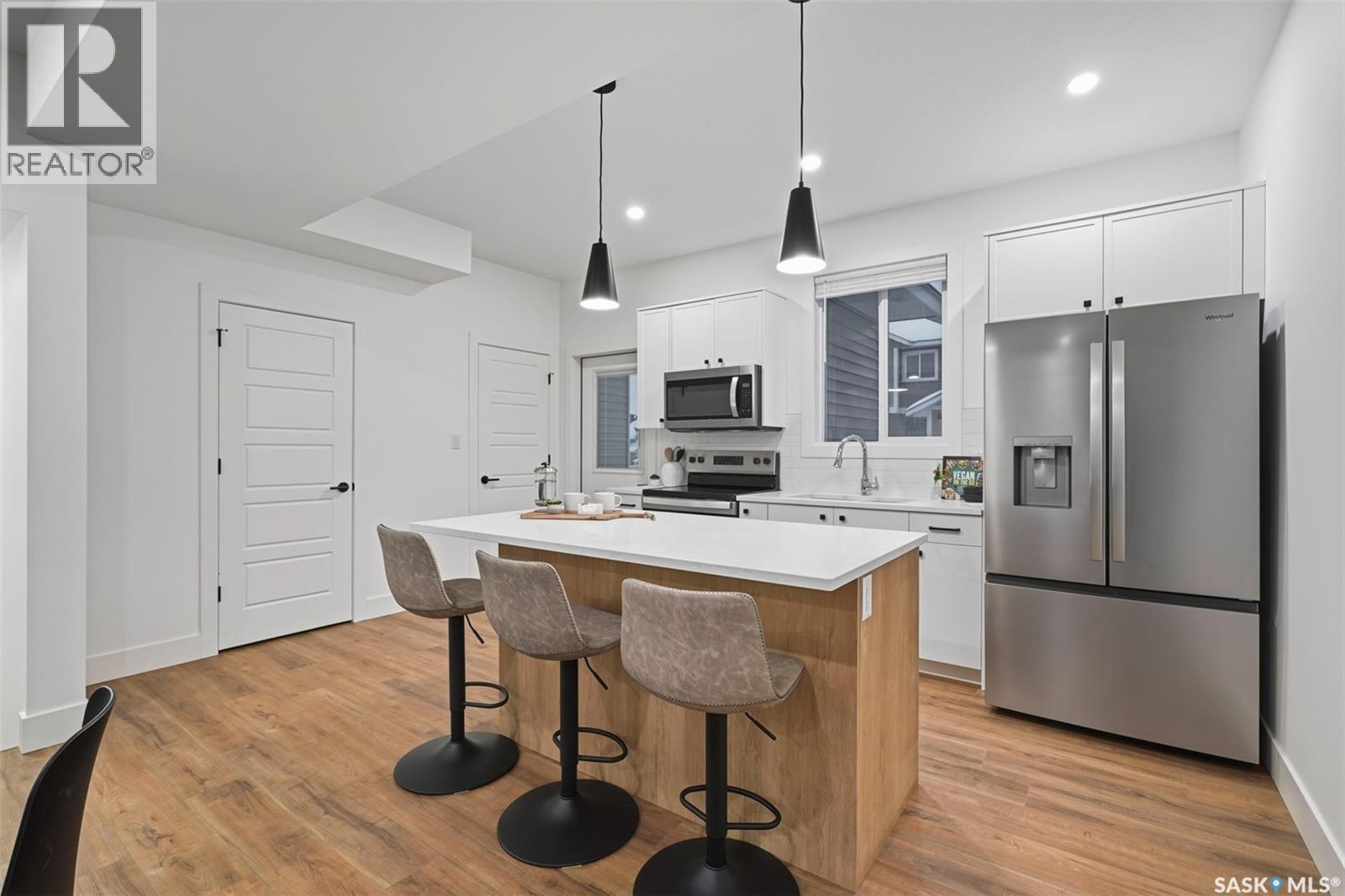 $245 MonthlyWelcome to 131–3220 11th Street West. A brand new, contemporary 3-storey townhouse offering the perfect blend of style, comfort, and functionality. Designed with modern living in mind, this home features an attached 2-car tandem style garage with a single drive and over 1,400 sq. ft. of thoughtfully designed space. Step inside to a bright and open second floor featuring 9 ft. ceilings, a spacious living and dining area, and a beautifully finished kitchen with quartz countertops, soft-close cabinetry, tiled backsplash, and a patio door to your balcony. A convenient 2-piece bath completes this level. Upstairs, the third floor offers a well-planned layout with 3 bedrooms and 2 full bathrooms, including a primary suite with a walk-in closet and beautiful ensuite. The additional 4-piece bath and laundry area are ideally located on the same floor for everyday convenience. Enjoy the practicality of a slab foundation providing durability and low maintenance, along with the peace of mind that comes with new construction. Located in the desirable Montgomery Place area, this development offers quiet residential living with quick access to Circle Drive, shopping, and amenities. Whether you’re a first-time buyer, young professional, or investor, this home checks all the boxes for modern, low-maintenance living. Photos are of a similar unit. (id:34297)