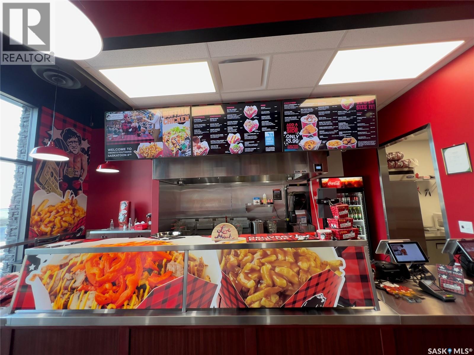 Exceptional Franchise Opportunity on 8th Street East! > Step into a highly successful, turn-key business with this Smoke's Poutinerie franchise located in one of Saskatoon's busiest retail corridors. Operating in a pristine, modern space (1,151 sq. ft.), this location boasts excellent street visibility, massive Pylon signage, and ample storefront parking. The store is fully equipped with top-tier commercial kitchen equipment, including a premium exhaust hood system, deep fryers, prep stations, and walk-in cooler—all in excellent working condition. Backed by a globally recognized Canadian brand, this location has built a strong local following and boasts a stellar 4.6-star rating on Uber Eats. With an incredibly secure lease in place until 2033 (plus two 5-year renewal options), this is a rare chance for an entrepreneur to take over a growing, cash-flowing business with all the heavy lifting (build-out and leasehold improvements) already done. Please DO NOT approach staff directly. Contact the listing agent for more details! (id:34297)