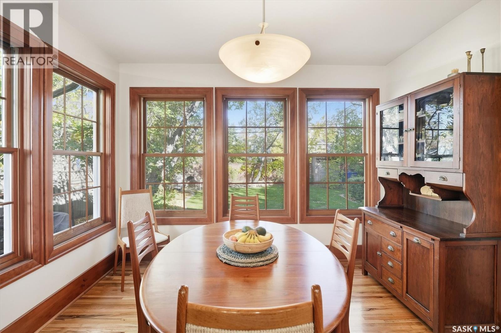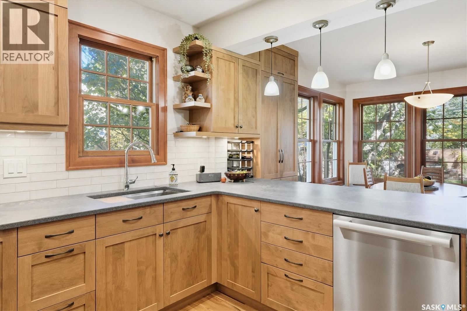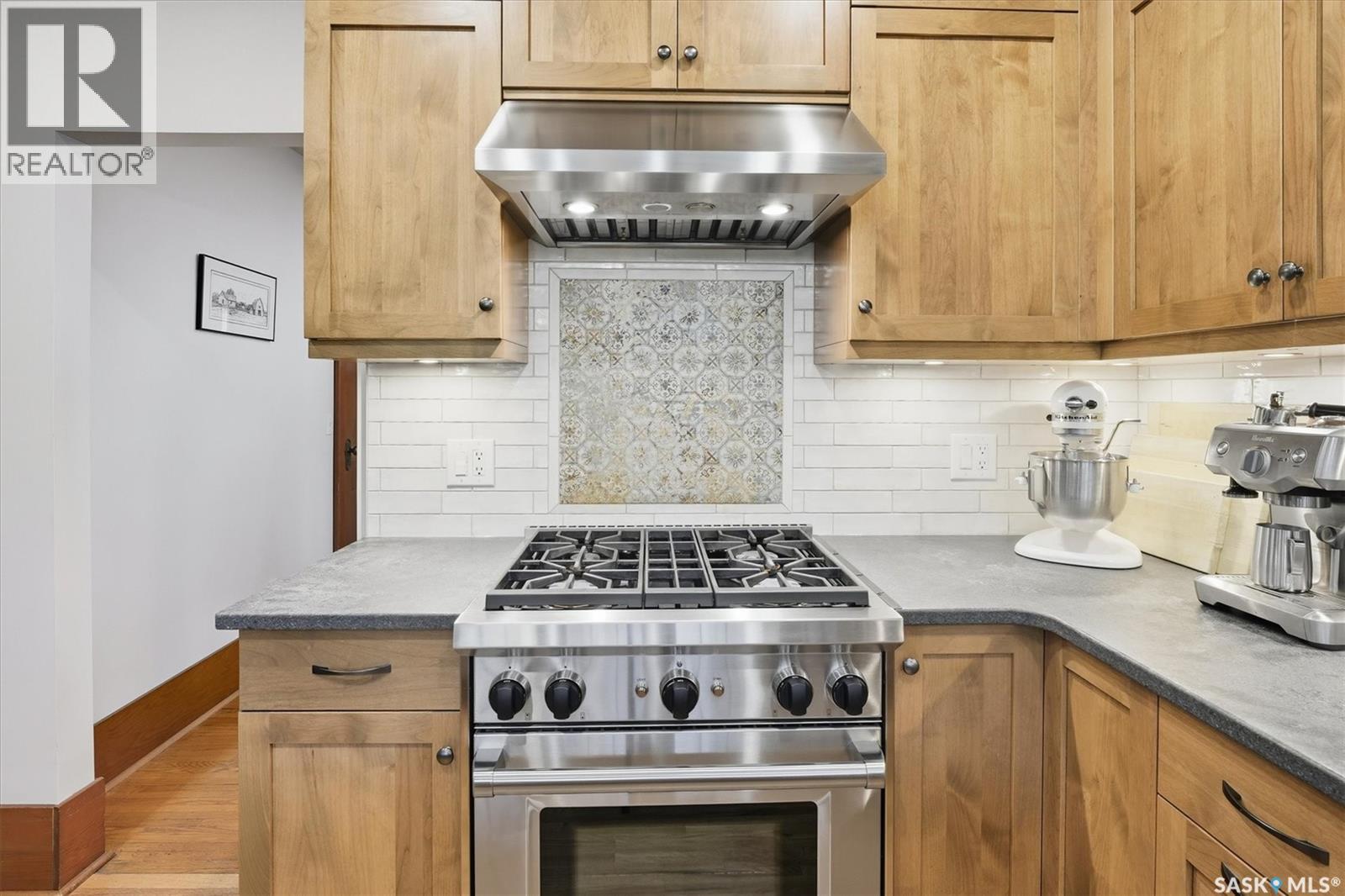 Welcome to 217 7th St East where timeless character meets modern comfort in this beautifully renewed home, ideally located just half a block from historic Buena Vista Park! Set on a stunning 50x125ft lot, the property offers an incredible backyard that’s perfect for entertaining or relaxing outdoors — a rare find in such a central location. Just imagine a thanksgiving football game back there! The home includes just under 3000sqft of living space with 5 bedrooms (2nd level is deemed a bedroom but is a great flex space) and 3 bathrooms. The home was lifted in 2001 with a new full height foundation added, providing lasting peace of mind vs. a home with an older foundation. Inside, you’ll find in-floor heating throughout the house and gorgeous hardwood flooring that flows through the main living spaces. The inviting living room centers around a classic wood-burning fireplace, creating a warm and welcoming atmosphere. The kitchen is a true highlight, thoughtfully designed with Miele & Wolf appliances — including a built-in fridge, freezer, and dishwasher — as well as a gas stove, steam oven, and direct-vented hood fan. Quartz countertops, custom Alder wood cabinetry, and Reidl millwork combine to create a kitchen that’s both stylish and highly functional. The kitchen has an abundance of windows overlooking the beautiful and mature back yard. Spacious and bright, this home offers a balance of open-concept living and private retreats. The loft area provides additional flexibility for an office, studio, bedroom or reading space. With its blend of high-end finishes, thoughtful updates, and unbeatable location near Saskatoon’s best walking trails, amenities and Broadway district, 217 7th Street E is a truly special place to call home. (id:34297)