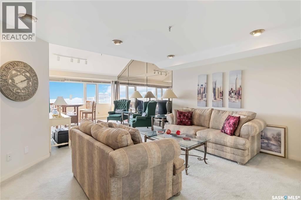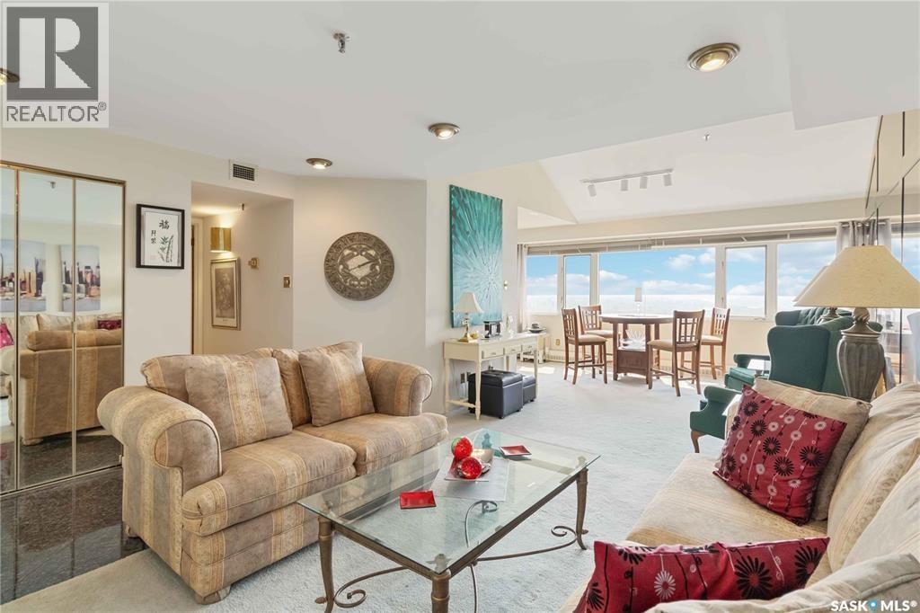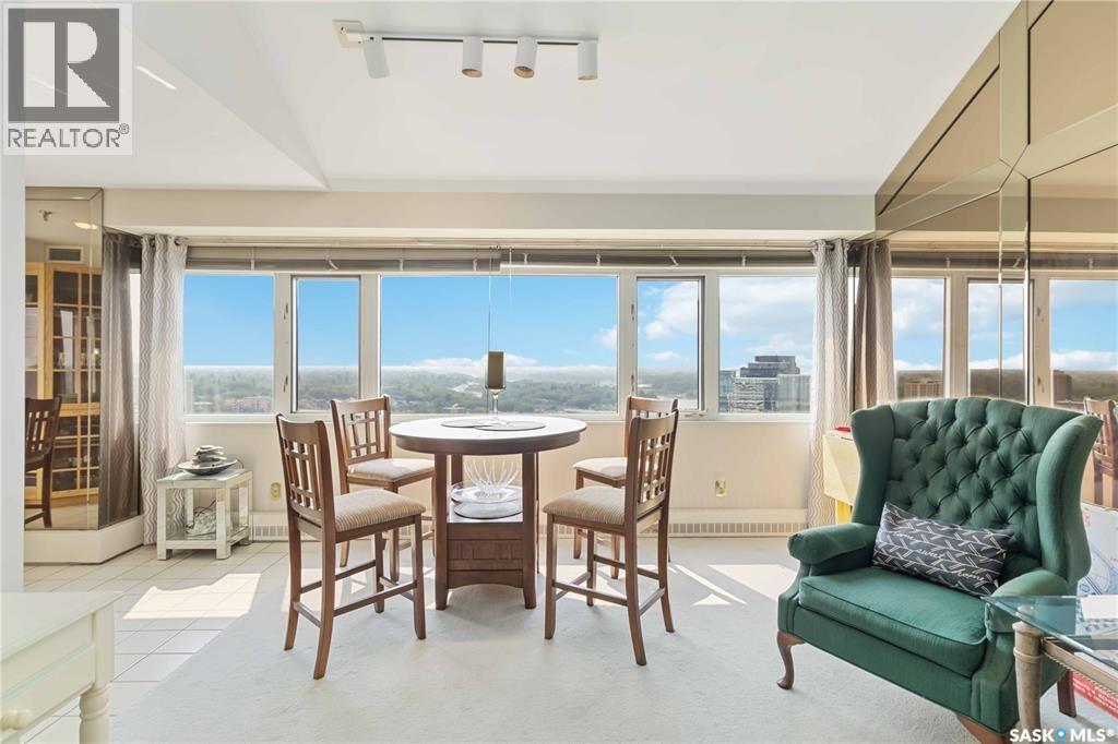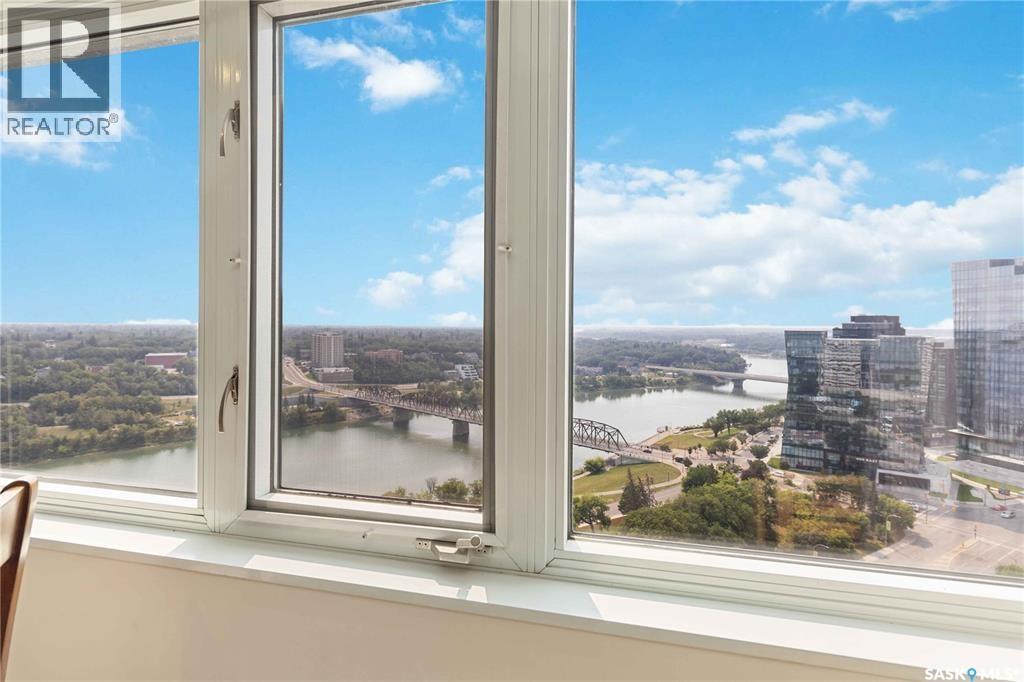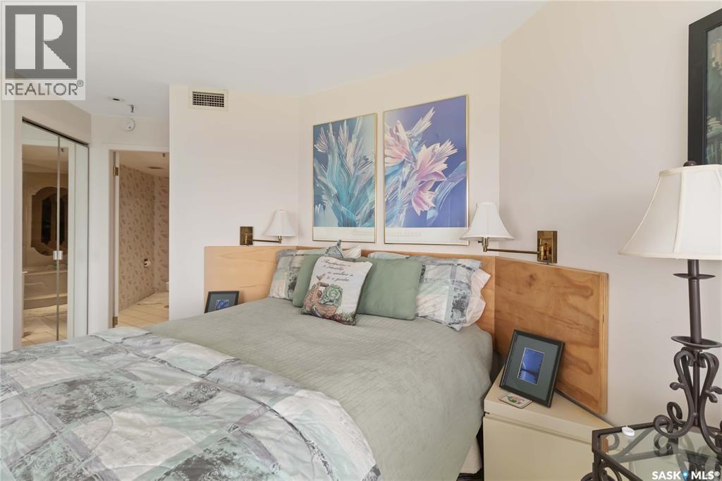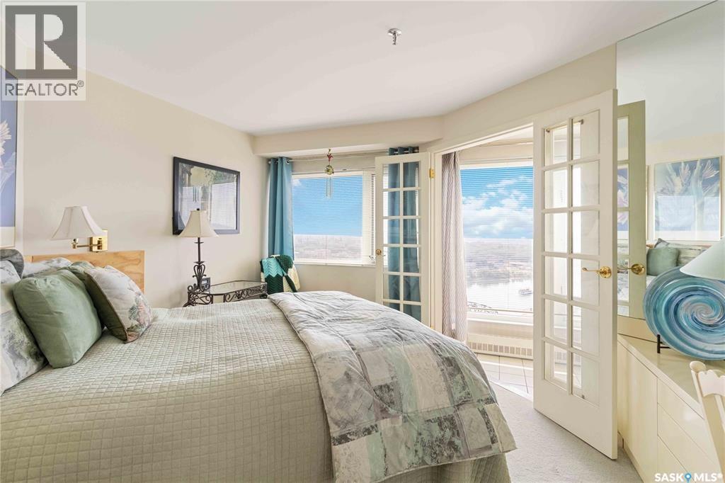 Penthouse suite! Absolutely one of a kind condo with some of the most amazing views in Saskatoon. This luxurious condo has gorgeous vaulted ceilings which offer the most spectacular framing of the incredible view. The master bedroom also has an unparalleled view and offers a large walk through closet and 5 piece bath complete with bidet and cultured marble jetted tub. The kitchen features built-in appliances and oak cabinetry, all of which display pride of ownership at its finest. This condominium provides the owner with access to the amenities at the hotel, including swimming pool, exercise area and discounts for owners in the restaurant. Also included is an underground parking stall and storage unit. Prepare yourself to experience this unique and rare opportunity! (id:34297)