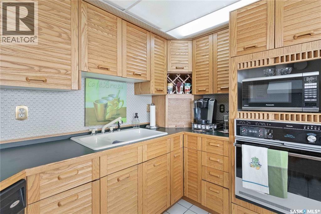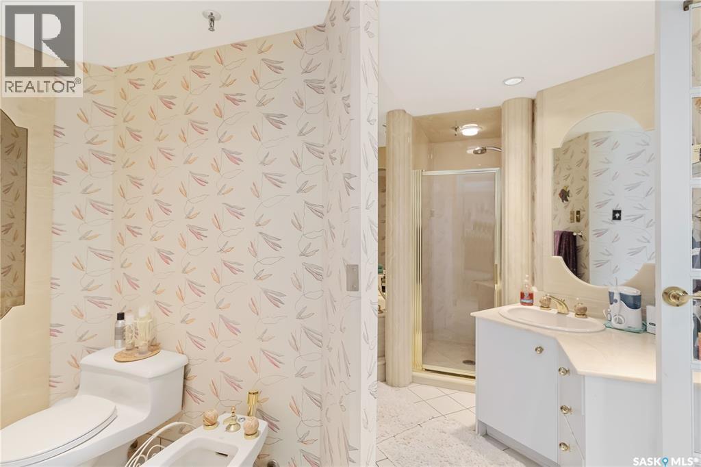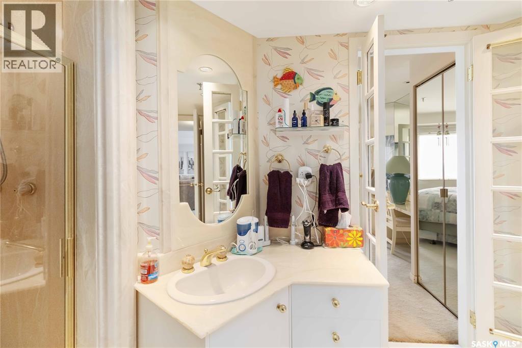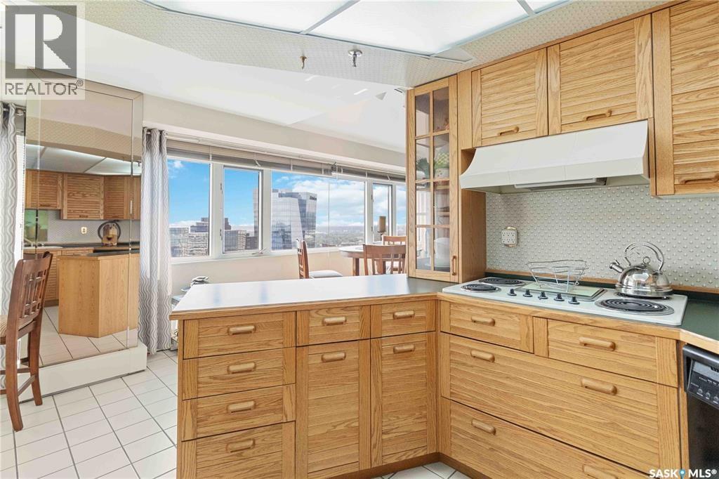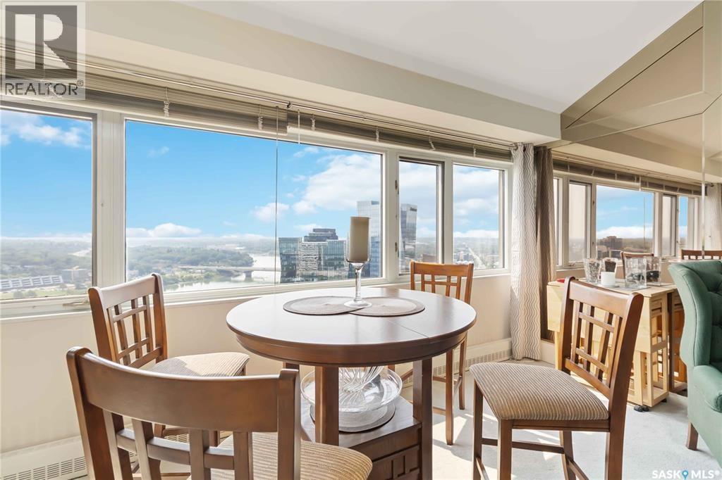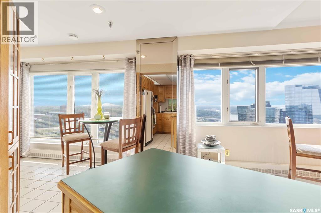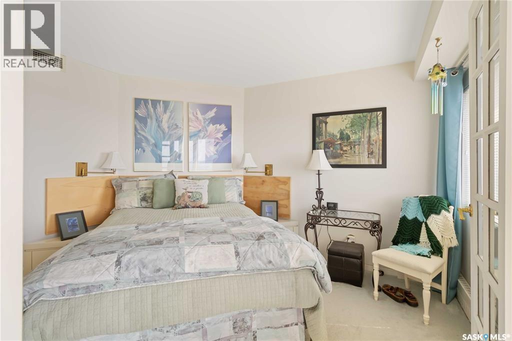 Penthouse suite! Absolutely one of a kind condo with some of the most amazing views in Saskatoon. This luxurious condo has gorgeous vaulted ceilings which offer the most spectacular framing of the incredible view. The master bedroom also has an unparalleled view and offers a large walk through closet and 5 piece bath complete with bidet and cultured marble jetted tub. The kitchen features built-in appliances and oak cabinetry, all of which display pride of ownership at its finest. This condominium provides the owner with access to the amenities at the hotel, including swimming pool, exercise area and discounts for owners in the restaurant. Also included is an underground parking stall and storage unit. Prepare yourself to experience this unique and rare opportunity! (id:34297)