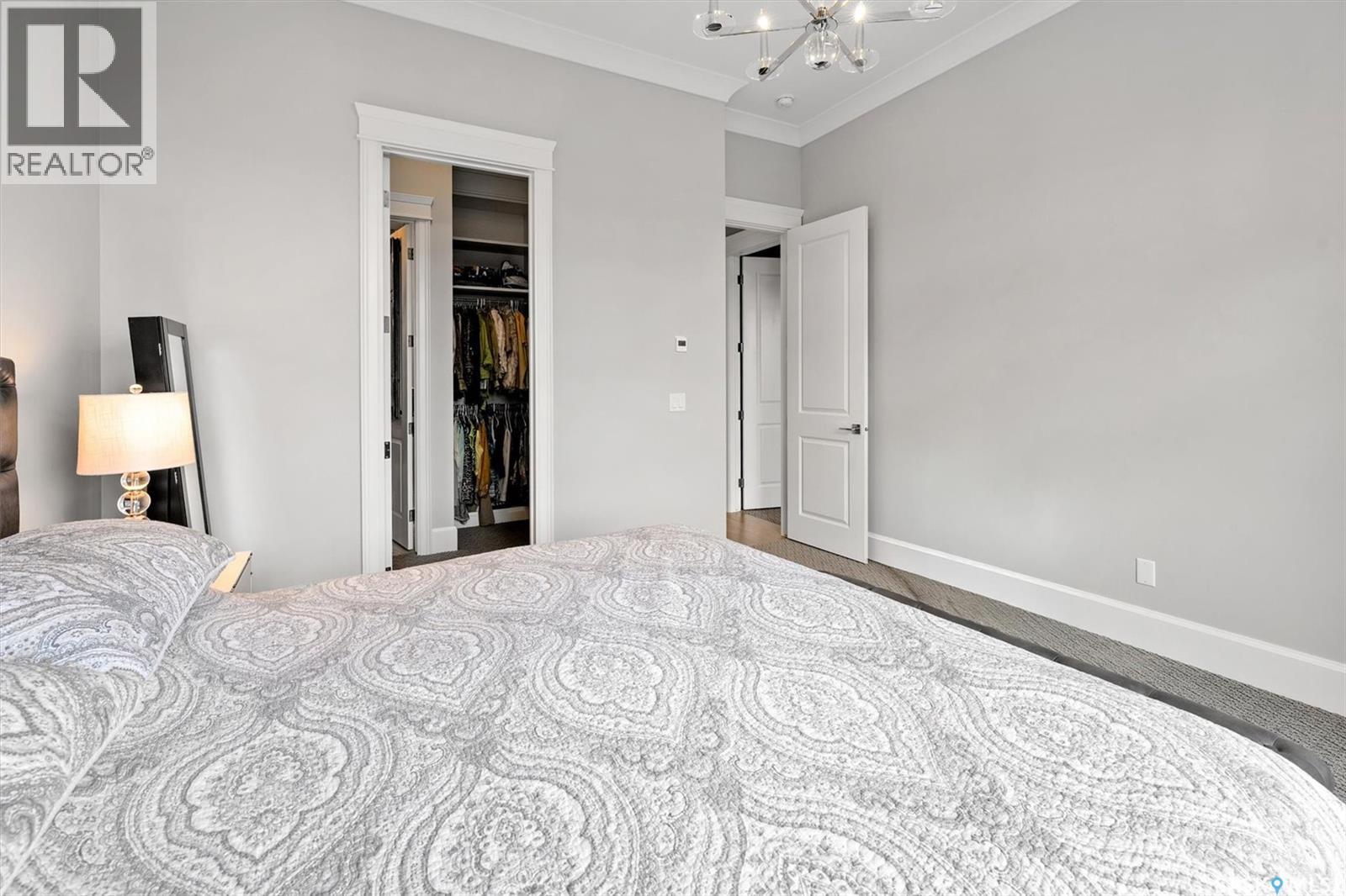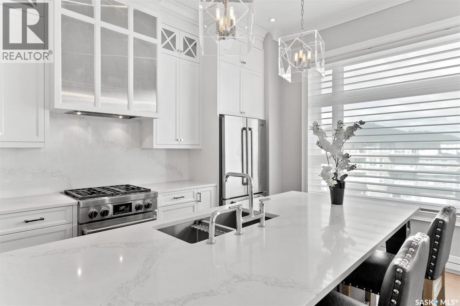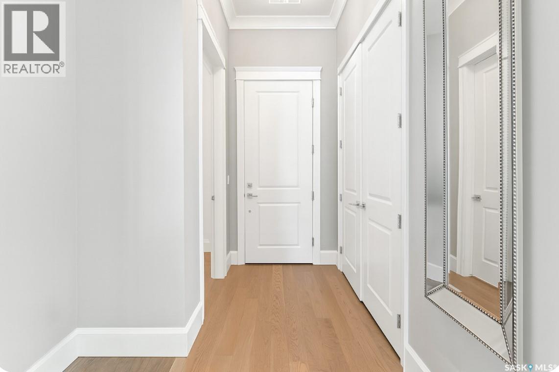 $630.34 MonthlyLuxurious 3rd Floor Corner Unit at The Willows Private Residences: Light-filled and like new, this 1,206 sq. ft. 2-bedroom, 2-bathroom condo offers elevated living in Saskatoon’s premier golf course community. Built by Valentino Homes and designed by Atmosphere Interior Design, this property features tall ceilings, wide plank white oak hardwood throughout, crown mouldings, and 8’ interior doors. The open floor plan includes a showpiece white lacquer shaker kitchen with full-height cabinetry, glass panel detail, pantry storage, stainless steel appliances, and gorgeous designer lighting. Two exceptionally large bedrooms include a primary suite with a custom outfitted walk-in closet w/ built in dresser, and a porcelain marble-clad 4 piece spa ensuite, equipped with quartz counters and glass entry tiled shower. A second full bath with porcelain marble tile and quartz, plus a spacious storage/flex room with built-in cabinetry (could service as a craft room) complete the floor plan. This esteemed condominium offers an amenity room, fitness centre, and two titled parking stalls (one underground, one surface), exceptionally maintained grounds and common areas, a storage unit, wheel chair access and visitor parking. Situated directly on the golf course, this is your opportunity to enjoy a luxury lifestyle at The Willows. (id:34297)