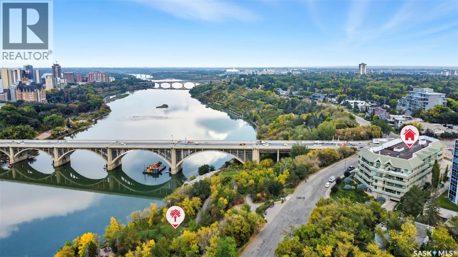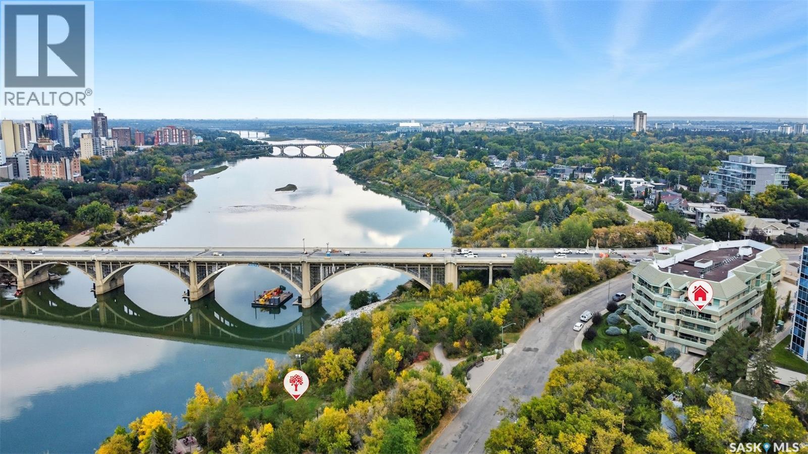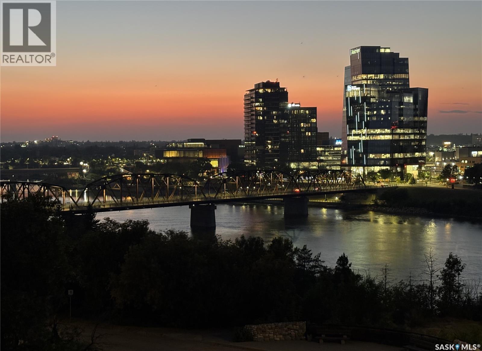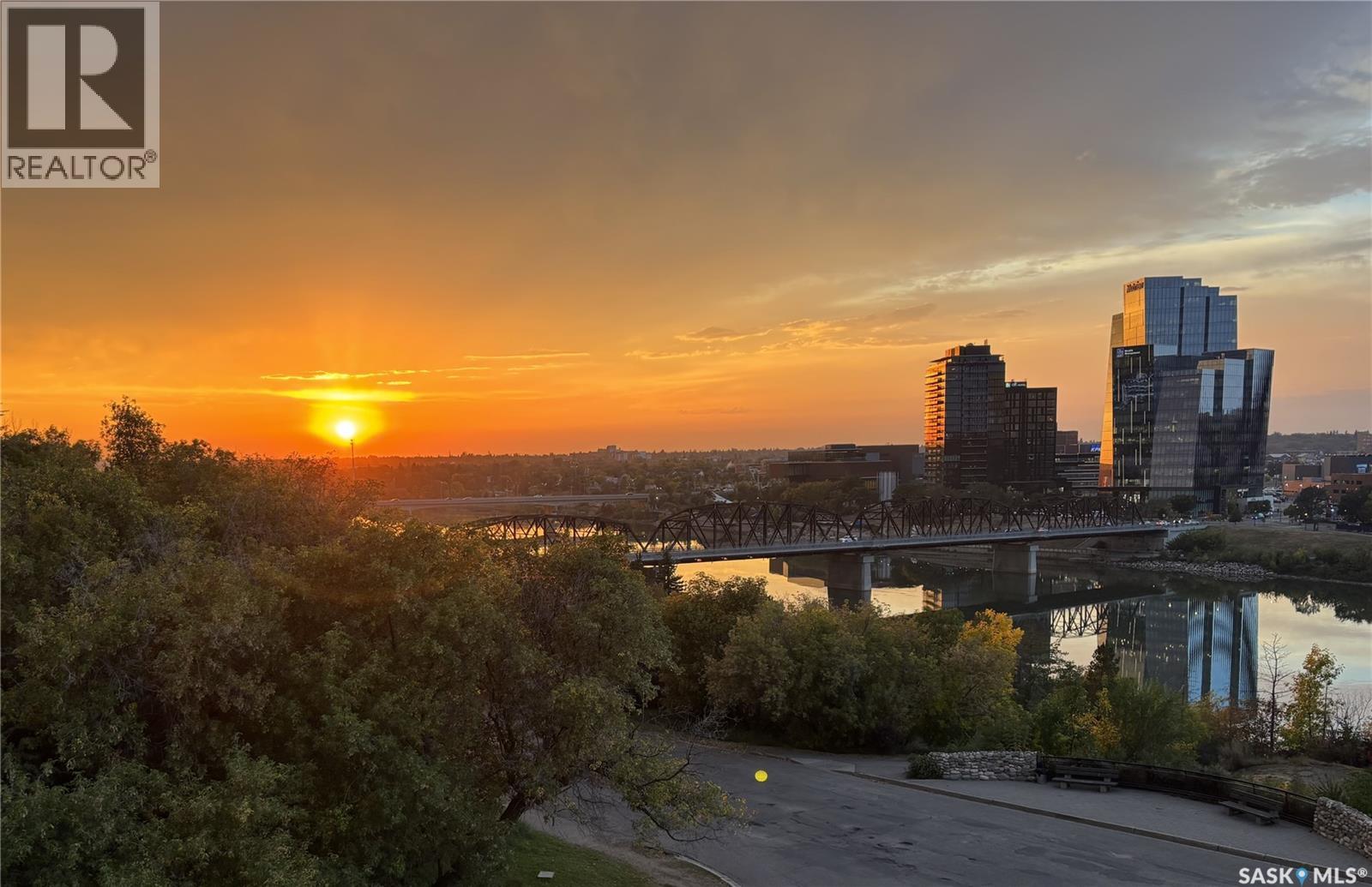 $895 MonthlyGorgeous river and downtown views are featured in this spacious 1,593 square foot THIRD FLOOR CORNER UNIT in the prestigious RIVERWALK condo building. Unit is 5th largest of 36 in RIVERWALK featuring 2 bedrooms PLUS large den (Or potential 3rd bedroom) and largest unit offered on MLS since 2003! This premiere location in Saskatoon is perched above Saskatchewan Crescent East and immediately adjacent to the Meewasin Valley park and trail system, and within walking distance of the downtown, University and the trendy Broadway shopping district. This quality Remai built building is of concrete and steel construction, and has stone and concrete tile exterior siding, triple pane windows and two elevators. Sweeping west to northwest river views from the balcony and from the open concept living, dining and kitchen areas, plus five additional large windows to the south. Roomy living and dining areas, and a spacious primary bedroom with ensuite bathroom featuring 5’ Jacuzzi soaker tub and separate shower. There is a second bedroom, an oversize den(or 3rd bedroom), and room for a freezer in the laundry room. Other notable features include solid maple framed kitchen cabinets, gas range, newer programmable thermostat with separate thermostat for the bedrooms, upgraded ceiling finish in the living areas, recently painted walls, ceilings, doors and trim, new toilets, and updated brushed nickel hardware and light fixtures. There is a Phantom screen to the balcony, and the balcony deck has been upgraded to an easy-to-clean urethane system with aggregate and clear finish top coats. There are TWO UNDERGROUND PARKING STALLS and two storage units in the heated garage. Building amenities include a well-equipped exercise room, meeting room, craft room and plenty of visitor parking. NOTE:Offers will be viewed at Monday OCT 27th at 5:00pm As per the Seller’s direction, all offers will be presented on 10/27/2025 5:00PM. (id:34297)