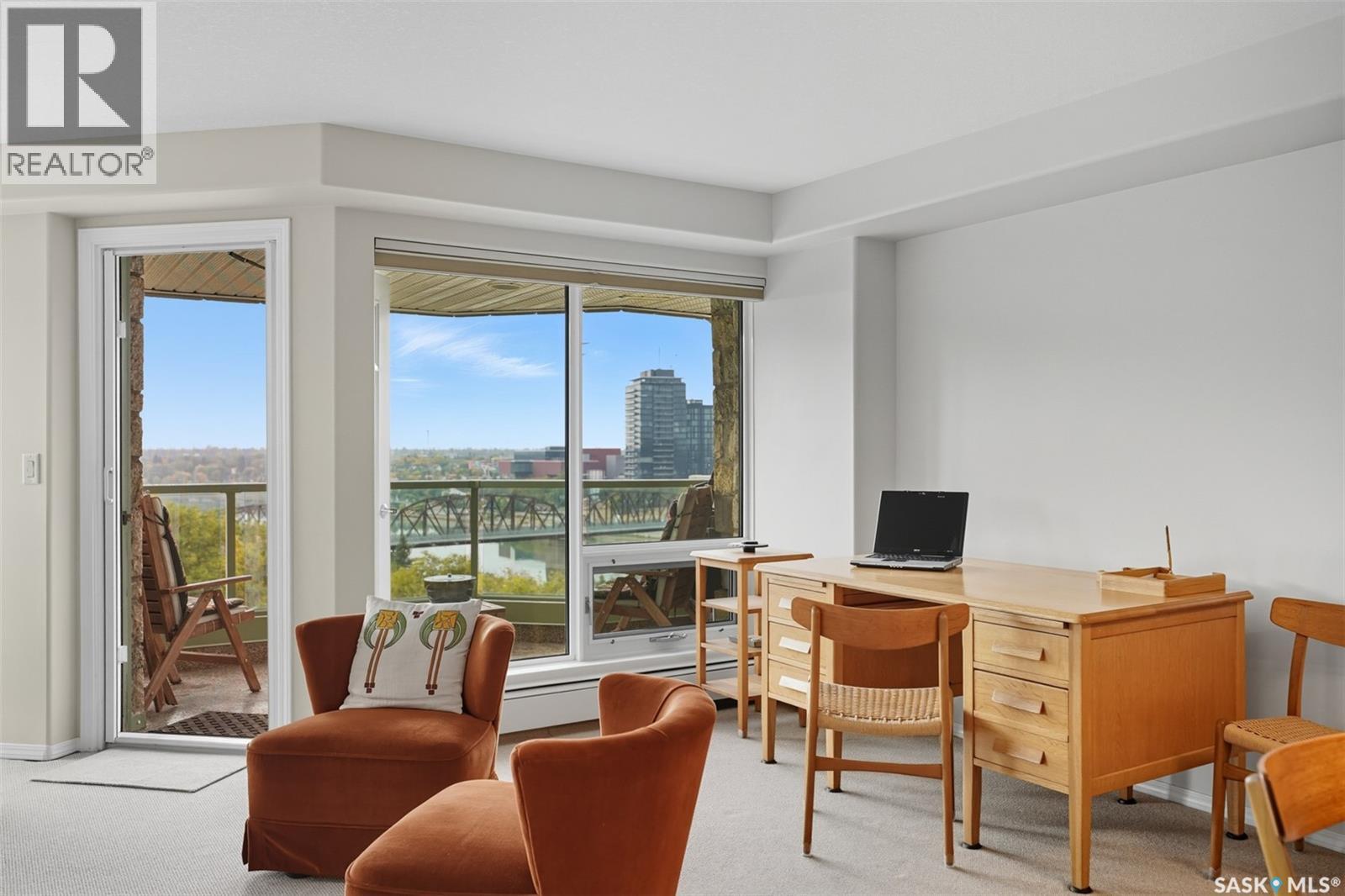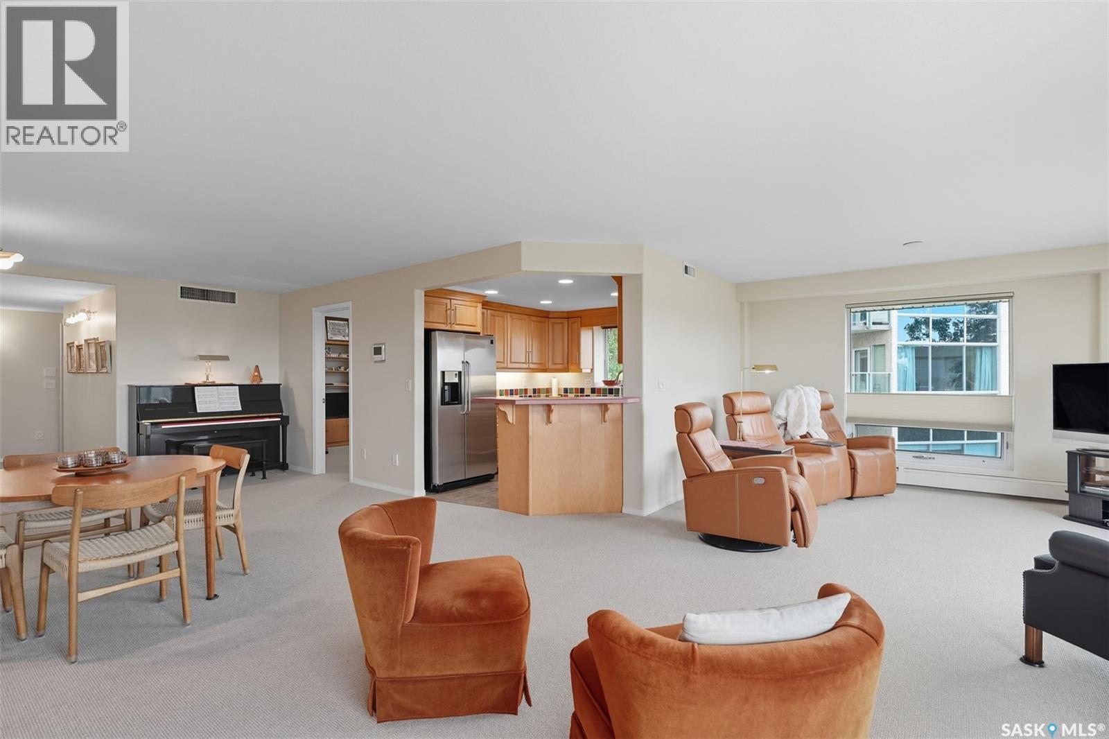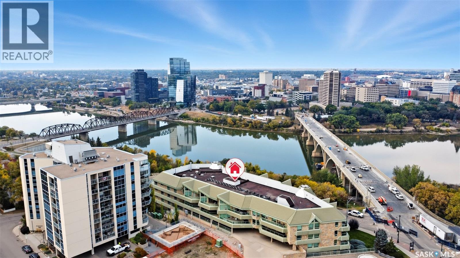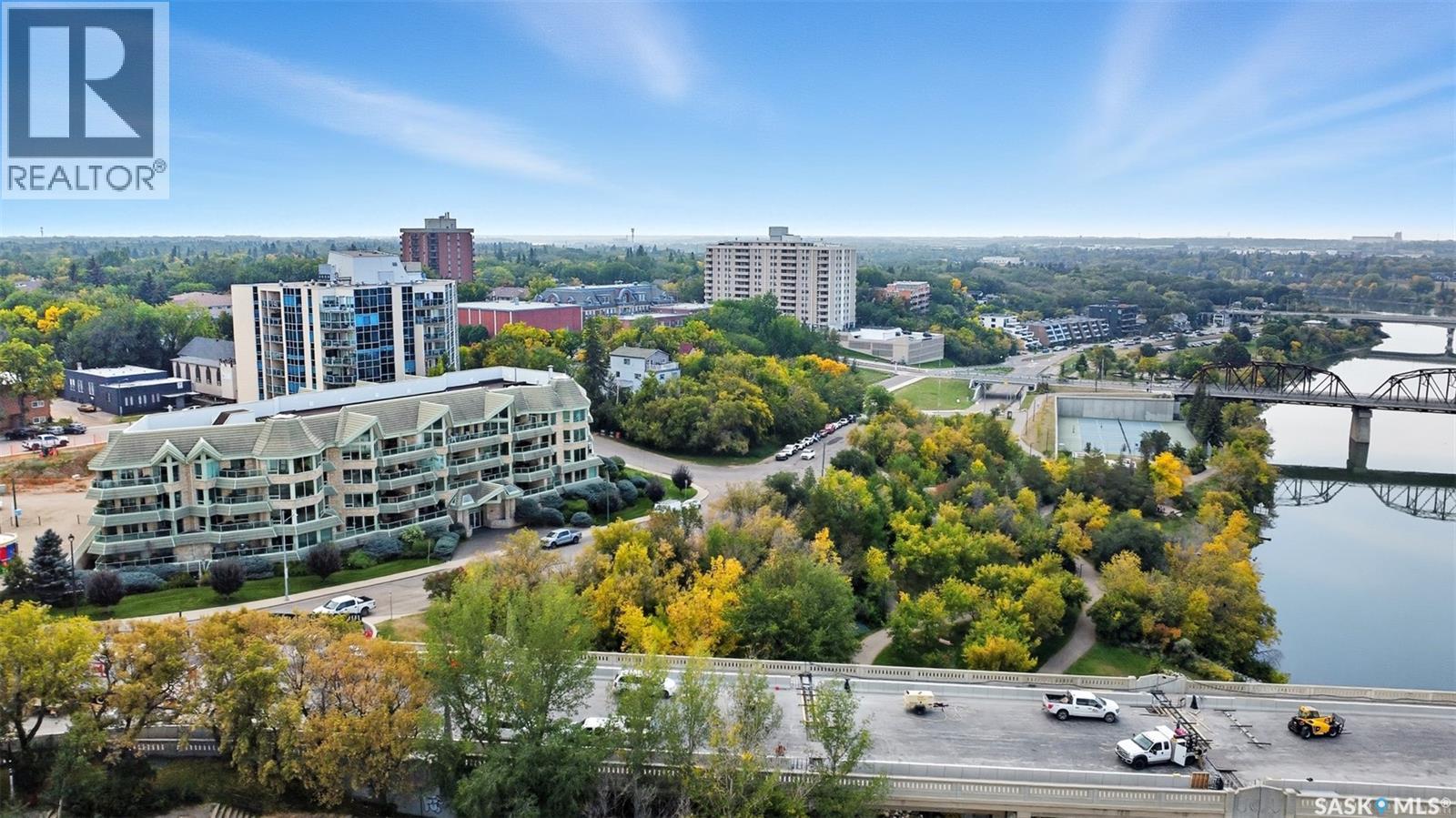 $895 MonthlyGorgeous river and downtown views are featured in this spacious 1,593 square foot THIRD FLOOR CORNER UNIT in the prestigious RIVERWALK condo building. Unit is 5th largest of 36 in RIVERWALK featuring 2 bedrooms PLUS large den (Or potential 3rd bedroom) and largest unit offered on MLS since 2003! This premiere location in Saskatoon is perched above Saskatchewan Crescent East and immediately adjacent to the Meewasin Valley park and trail system, and within walking distance of the downtown, University and the trendy Broadway shopping district. This quality Remai built building is of concrete and steel construction, and has stone and concrete tile exterior siding, triple pane windows and two elevators. Sweeping west to northwest river views from the balcony and from the open concept living, dining and kitchen areas, plus five additional large windows to the south. Roomy living and dining areas, and a spacious primary bedroom with ensuite bathroom featuring 5’ Jacuzzi soaker tub and separate shower. There is a second bedroom, an oversize den(or 3rd bedroom), and room for a freezer in the laundry room. Other notable features include solid maple framed kitchen cabinets, gas range, newer programmable thermostat with separate thermostat for the bedrooms, upgraded ceiling finish in the living areas, recently painted walls, ceilings, doors and trim, new toilets, and updated brushed nickel hardware and light fixtures. There is a Phantom screen to the balcony, and the balcony deck has been upgraded to an easy-to-clean urethane system with aggregate and clear finish top coats. There are TWO UNDERGROUND PARKING STALLS and two storage units in the heated garage. Building amenities include a well-equipped exercise room, meeting room, craft room and plenty of visitor parking. NOTE:Offers will be viewed at Monday OCT 27th at 5:00pm As per the Seller’s direction, all offers will be presented on 10/27/2025 5:00PM. (id:34297)