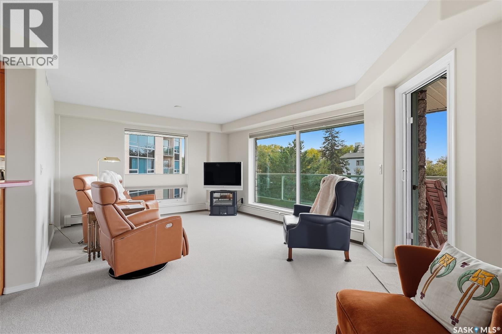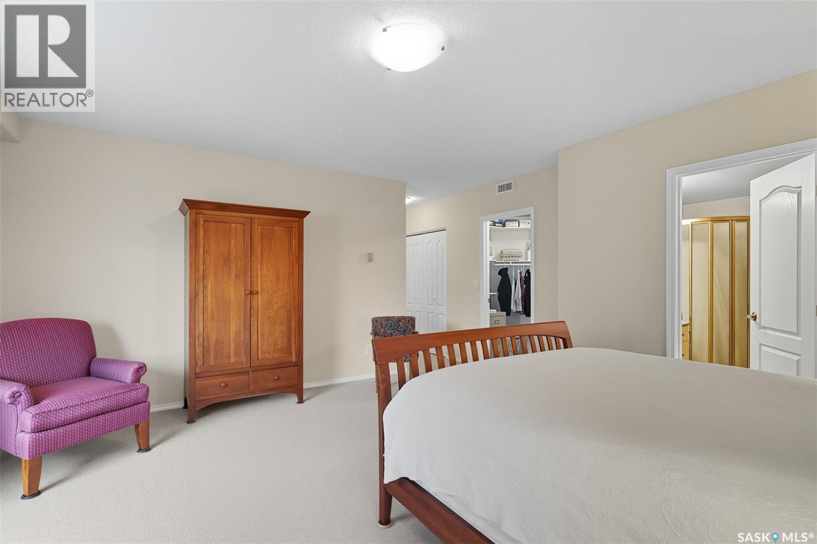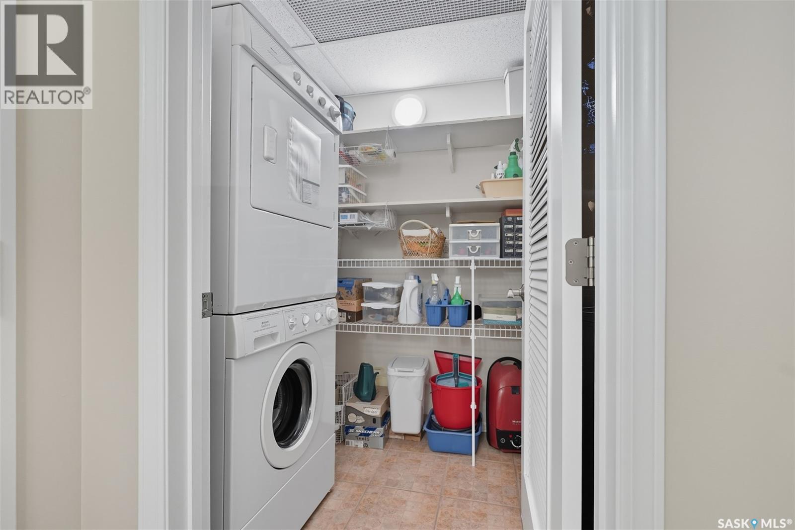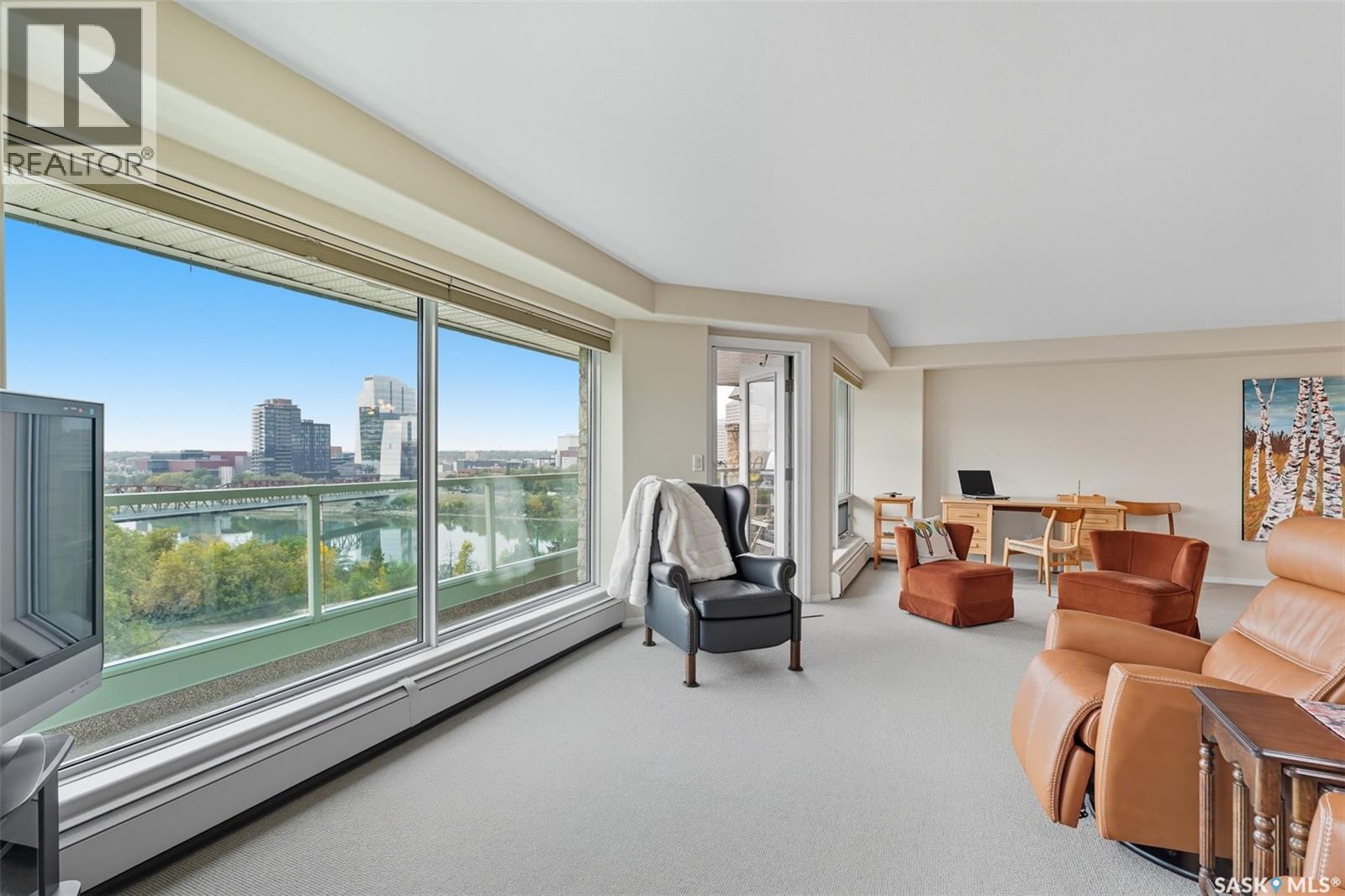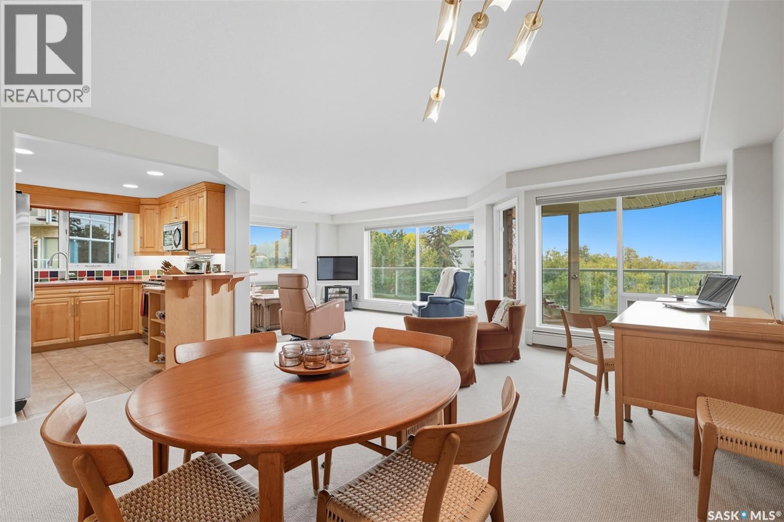 $895 MonthlyGorgeous river and downtown views are featured in this spacious 1,593 square foot THIRD FLOOR CORNER UNIT in the prestigious RIVERWALK condo building. Unit is 5th largest of 36 in RIVERWALK featuring 2 bedrooms PLUS large den (Or potential 3rd bedroom) and largest unit offered on MLS since 2003! This premiere location in Saskatoon is perched above Saskatchewan Crescent East and immediately adjacent to the Meewasin Valley park and trail system, and within walking distance of the downtown, University and the trendy Broadway shopping district. This quality Remai built building is of concrete and steel construction, and has stone and concrete tile exterior siding, triple pane windows and two elevators. Sweeping west to northwest river views from the balcony and from the open concept living, dining and kitchen areas, plus five additional large windows to the south. Roomy living and dining areas, and a spacious primary bedroom with ensuite bathroom featuring 5’ Jacuzzi soaker tub and separate shower. There is a second bedroom, an oversize den(or 3rd bedroom), and room for a freezer in the laundry room. Other notable features include solid maple framed kitchen cabinets, gas range, newer programmable thermostat with separate thermostat for the bedrooms, upgraded ceiling finish in the living areas, recently painted walls, ceilings, doors and trim, new toilets, and updated brushed nickel hardware and light fixtures. There is a Phantom screen to the balcony, and the balcony deck has been upgraded to an easy-to-clean urethane system with aggregate and clear finish top coats. There are TWO UNDERGROUND PARKING STALLS and two storage units in the heated garage. Building amenities include a well-equipped exercise room, meeting room, craft room and plenty of visitor parking. NOTE:Offers will be viewed at Monday OCT 27th at 5:00pm As per the Seller’s direction, all offers will be presented on 10/27/2025 5:00PM. (id:34297)