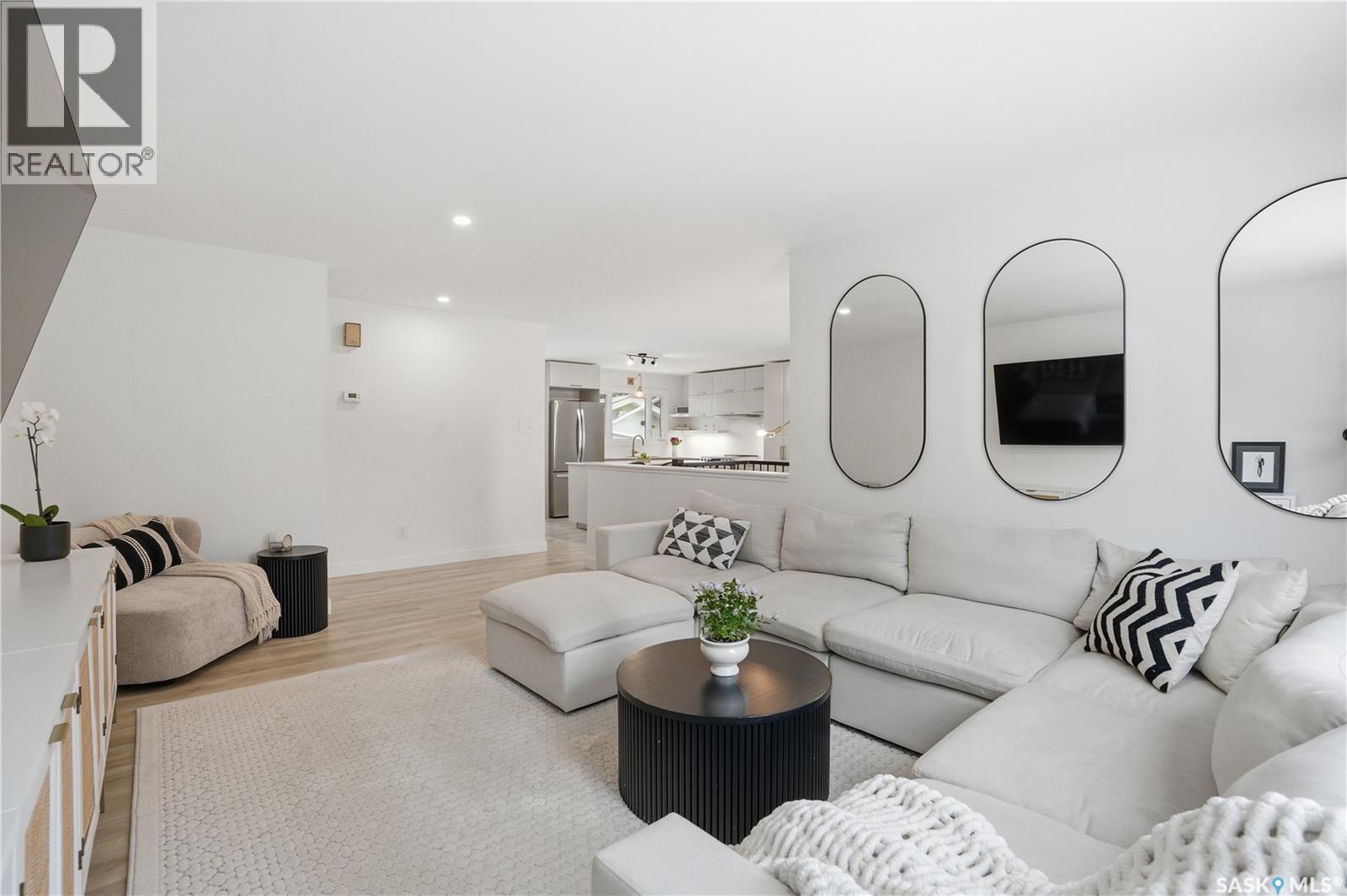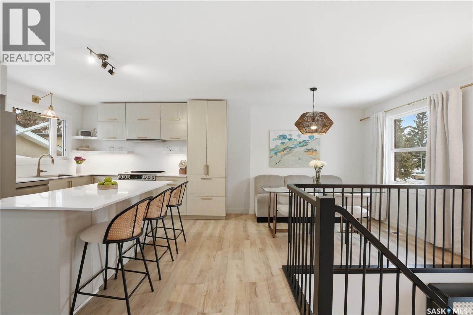 Welcome to this top to bottom, beautifully renovated 1,120 sq ft bi-level home located in the highly sought-after River Heights neighbourhood of Saskatoon. Bright and inviting, it features 5 bedrooms, 2 fully renovated bathrooms, offering the perfect blend of modern style in a mature neighbourhood. The open-concept main floor is designed for entertaining, showcasing a spacious living room filled with natural light, a formal dining area, and a stunning kitchen complete with all-new cabinetry, quartz countertops, modern lighting, and a large eat-in island. The window over the sink overlooks the backyard — ideal for keeping an eye on the kids while you cook. Unique gold and wicker accents throughout add warmth and contemporary charm. The fully developed lower level benefits from the true bi-level design, with large windows that make the space feel bright and open. It features an additional bedroom, a versatile den, and a cozy wood-burning fireplace. Extensive renovations completed in 2023 include new lower level windows, kitchen, bathrooms, flooring, exterior doors, and a fully reimagined open-concept layout on both levels, along with a rebuilt composite deck, regraded backyard, and new concrete. Additional updates include new AC (2023) and new engineered wood siding (2026). The property is complete with a double detached garage. Ideally situated close to the Meewasin Trail, this home offers easy access to biking, walking, and cross-country skiing year-round. Enjoy a quick commute to downtown Saskatoon, the airport, and all major amenities, making this a truly central and convenient location. This is a rare opportunity to own a move-in ready, fully updated home in one of Saskatoon’s most desirable neighbourhoods. (id:34297)