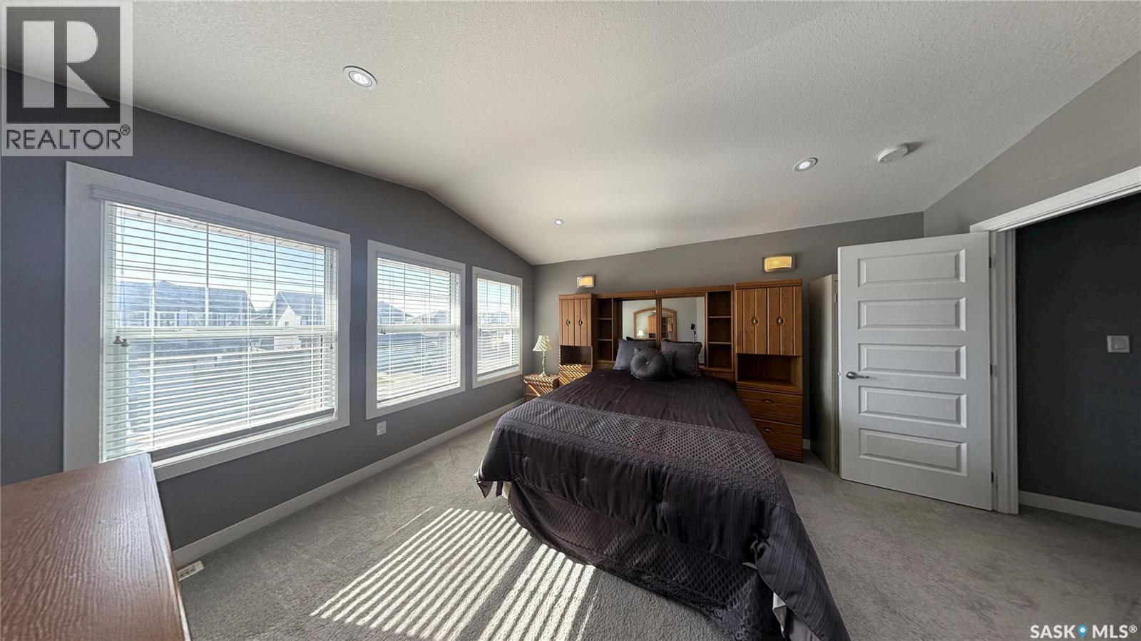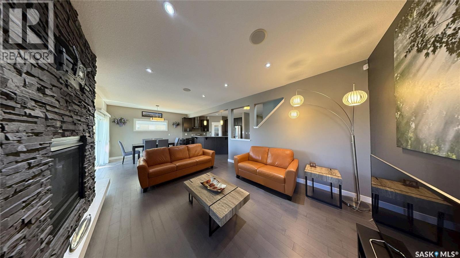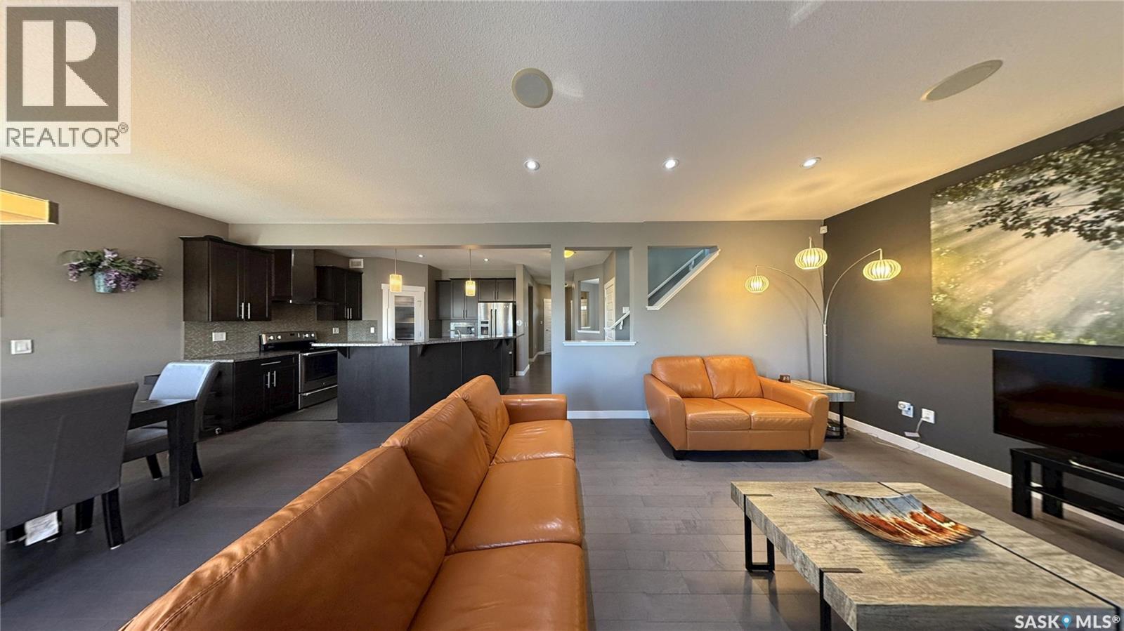 Experience elevated living in this exquisitely crafted executive CUSTOM BUILT home, offering over 2,200 sq ft of impeccably designed space in Saskatoon’s prestigious ROSEWOOD community. From the striking curb appeal with turf and a covered COMPOSITE DECK entry to the show home-level finishes throughout, every detail exudes LUXURY. The main floor features rich HARDWOOD FLOORS, 9 FEET ceilings, a private DEN, designer powder room, and stainless steel appliances equipped kitchen with GRANITE COUNTERTOPS, SOFT-CLOSE SUPERIOR CABINETRY, walk-in pantry, and a TWO-TIER ISLAND. The open-concept dining and living areas flow to a composite deck and professionally landscaped yard backing onto both Public and Catholic schools. Upstairs, retreat to a vaulted-ceiling PRIMARY BEDROOM with a 5 piece ensuite and walk-in closet. Comfort of a Laundry area with storage on 2nd floor next to Primary bedroom. Central Vac system. THREE ADDITIONAL BEDROOMS on the second level, a stylish main bath (DOUBLE VANITY), bonus room, and upper laundry. The fully developed basement includes a sound-insulated home theatre wired for projector and surround sound, a bedroom, 4 Piece bath, gym/flex space, and extensive storage The Basement has new upgraded carpet installed. With central A/C, built-in speakers, triple-pane windows, Hunter Douglas blinds, a fully finished oversized garage, and high-end upgrades throughout, this move-in-ready home is an opportunity for those who demand comfort, function, and refined design—all in one. Buyers & Buyers' Realtor® to verify all measurements (id:34297)