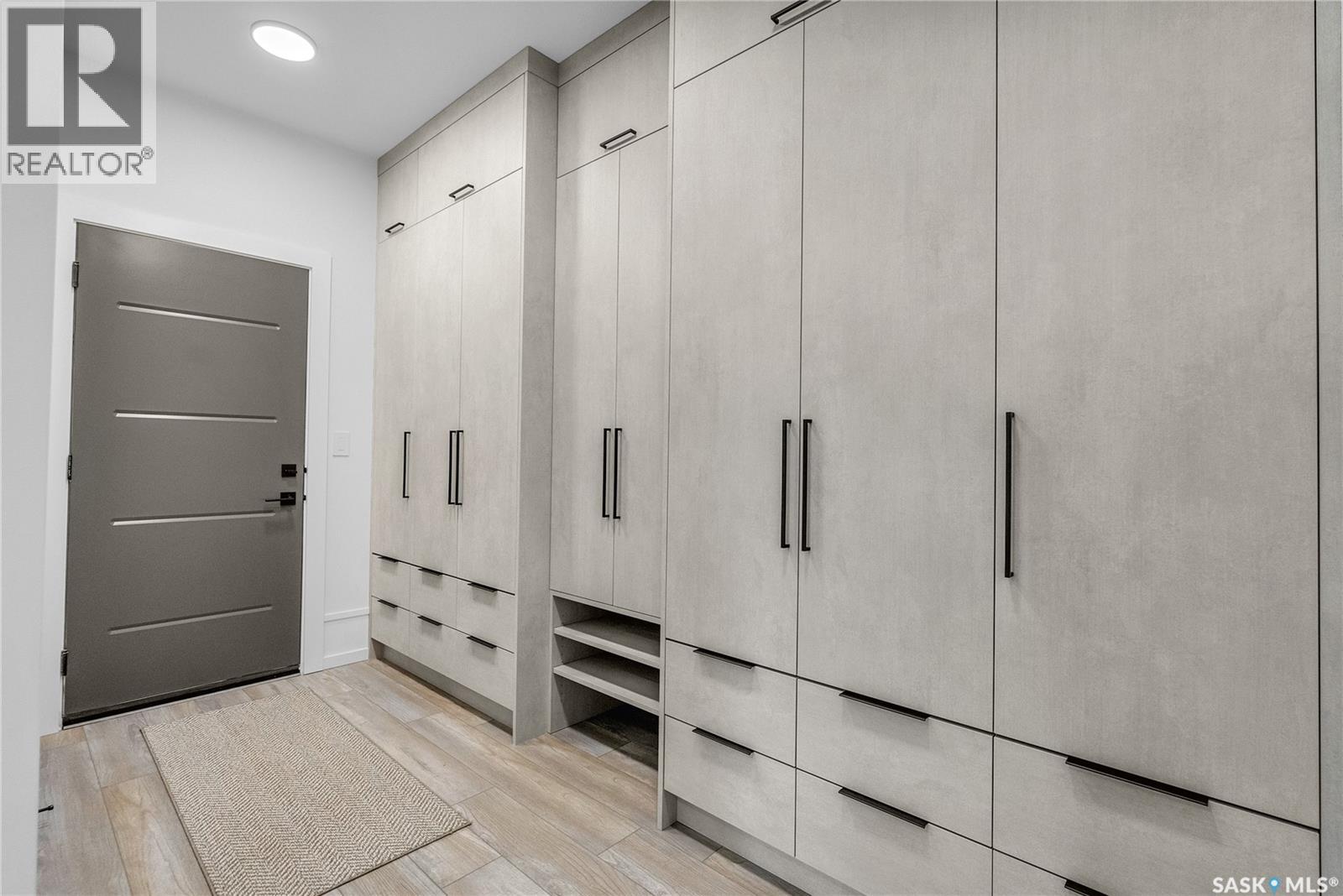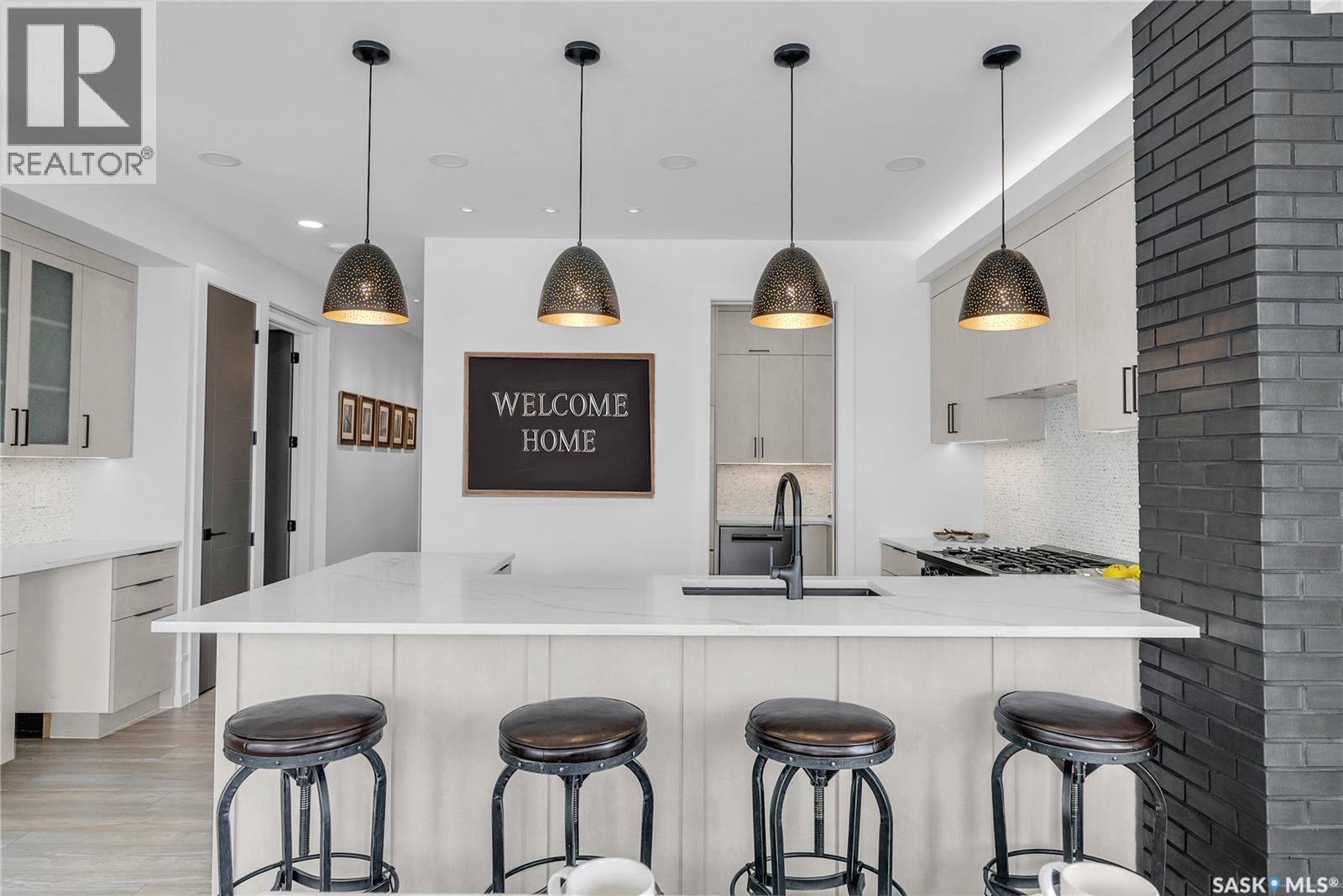 Homes by Norwood located at 428 Woolf Bend in Saskatoon’s Aspen Ridge, featuring luxury finishes and expert craftsmanship. The spacious foyer welcomes you, stained wood railings and glass staircase inserts lead to 2nd floor. Engineered Vinyl Plank flooring throughout home. The main floor boasts 8’ interior doors, 9’ ceilings with LED-lit tray designs, a great room with a brick feature wall, large south-facing windows, and a dining area with sliding doors to a 12’x12’ covered deck. The gourmet kitchen includes modern cabinetry, a 6-burner gas convection range, warming tray, range hood, LED strip lighting, tile backsplash, quartz countertops, and a peninsula bar, with an adjoining butler’s pantry offering a fridge/freezer, dishwasher, microwave, prep sink, spice rack, and ample storage. The primary bedroom features a custom feature wall and insulated walls for sound comfort, while the ensuite offers dual vanities, a custom walk-in shower, abundant storage, a stacking washer/dryer, and a private commode. Additional main-floor spaces include a 2-piece powder room and mudroom with extensive storage. The second floor has three large bedrooms with interior insulated walls, a second laundry room with a sink, and a split main bathroom with dual vanities, a soaker tub/shower with tile, and separate lavatory. The basement’s exterior walls are framed, insulated, and wired, with interior walls framed and wired as well. Mechanical features include a high-efficiency furnace with zoned heating and thermostats on each floor, a power vent hot water heater with a circulating pump, an HRV system, central air, and 200-amp electrical service. The 27’W x 26’D double attached garage is insulated, wired, drywalled, has LED lighting, and is nearly 14’ high for future car lifts. The exterior features Hardie board siding, composite finishes, and a maintenance-free covered deck with a privacy wall and natural gas outlet. Enjoy breathtaking south views of Kernen Prairie—schedule a viewing today (id:34297)