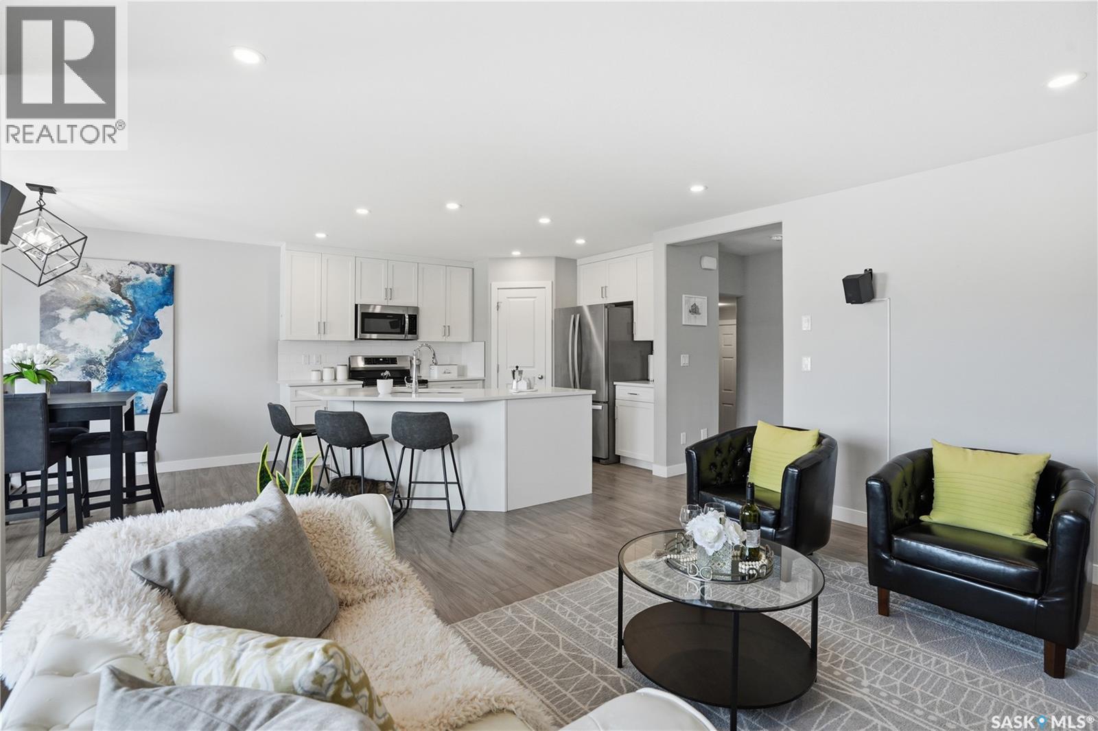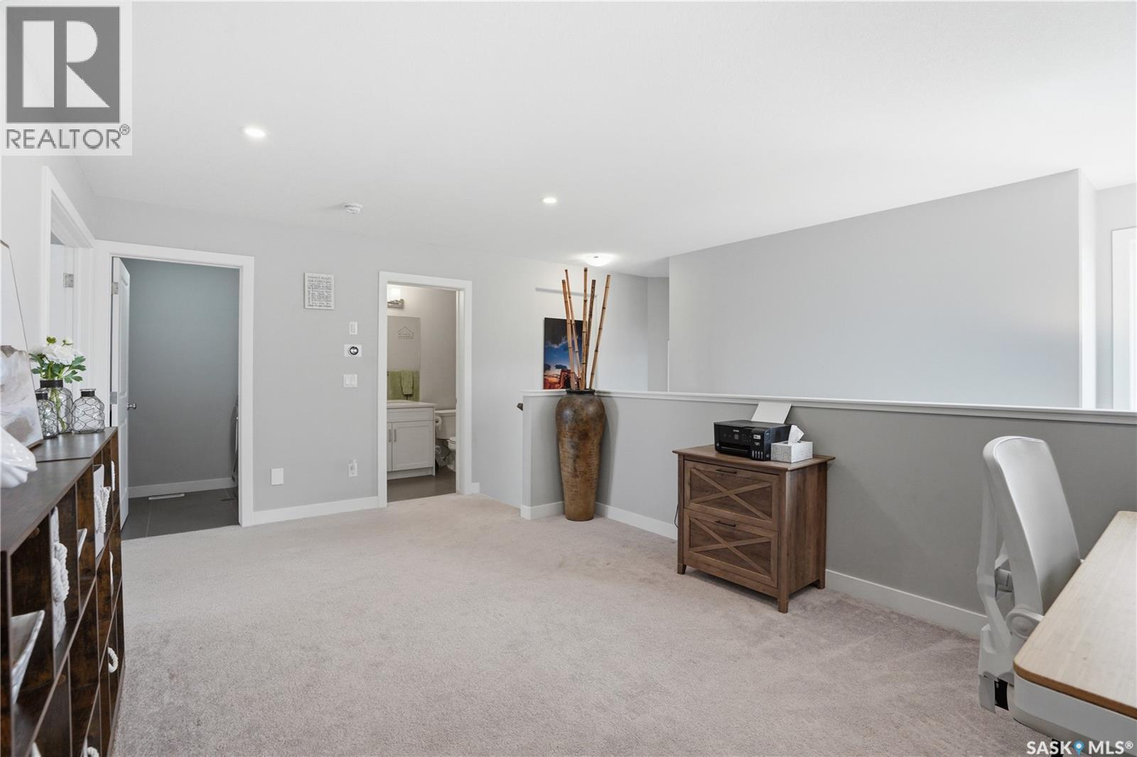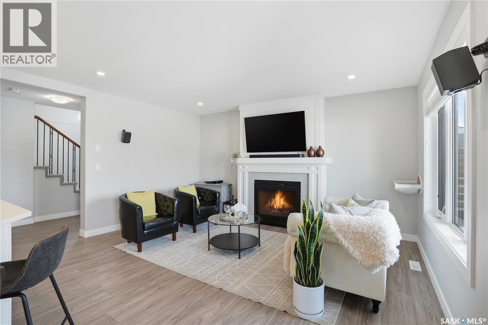 Better than brand new and truly move-in ready, this stunning two-storey home is set on one of Brighton’s most sought-after, family-friendly streets. Enjoy a welcoming sense of community where kids play outside and neighbours connect, exceptional privacy with no rear neighbours. The vinyl and stone exterior offers great curb appeal, with a double concrete driveway leading to an insulated attached garage with a brand-new natural gas heater on its own smart thermostat. Step into the fully fenced west-facing backyard—perfect for family time and entertaining, featuring a composite deck with privacy wall and a 30' x 6' raised garden with inset steps, and an 8' x 10' storage shed. Inside, the bright open-concept main floor is designed for everyday living, with large windows, a cozy gas fireplace, and a stylish kitchen with white cabinetry, quartz countertops, stainless steel appliances, an oversized island, fridge with water and ice, and a convection/air fryer oven. The dining area overlooks the backyard, while a powder room and direct garage access complete the main level. Upstairs offers space for the whole family with 10-foot ceilings in the secondary bedrooms, a spacious bonus room, convenient laundry, and two generous bedrooms. The primary suite is a true retreat, featuring double French doors, a walk-in closet with custom cabinetry, and a spa-like ensuite with a deep soaker tub, oversized shower, and dual sinks. Additional highlights include an oversized A/C unit, Google Nest smart thermostat, central vacuum with attachments, recently serviced HVAC and furnace, and an unfinished basement roughed-in for future development. Located just minutes from parks, ponds, walking trails, and amenities—and only seven minutes to the University of Saskatchewan—this home offers the perfect blend of family living, community, and modern comfort. A rare opportunity on one of Brighton’s best streets—this is the kind of home families wait for. (id:34297)