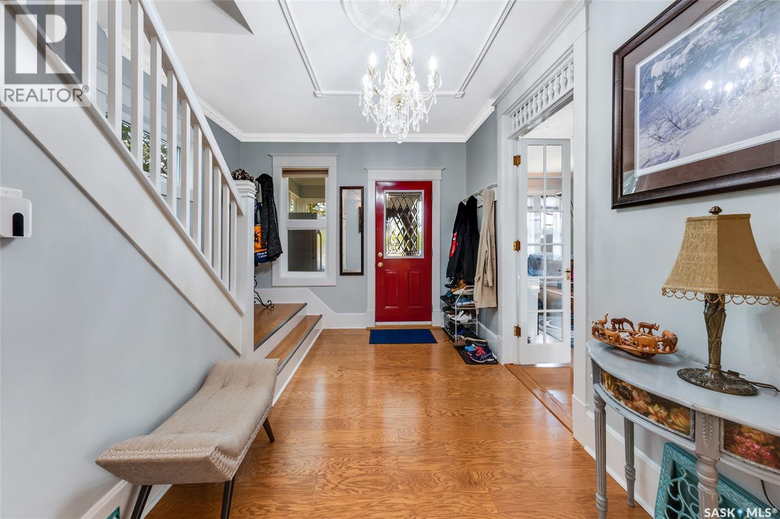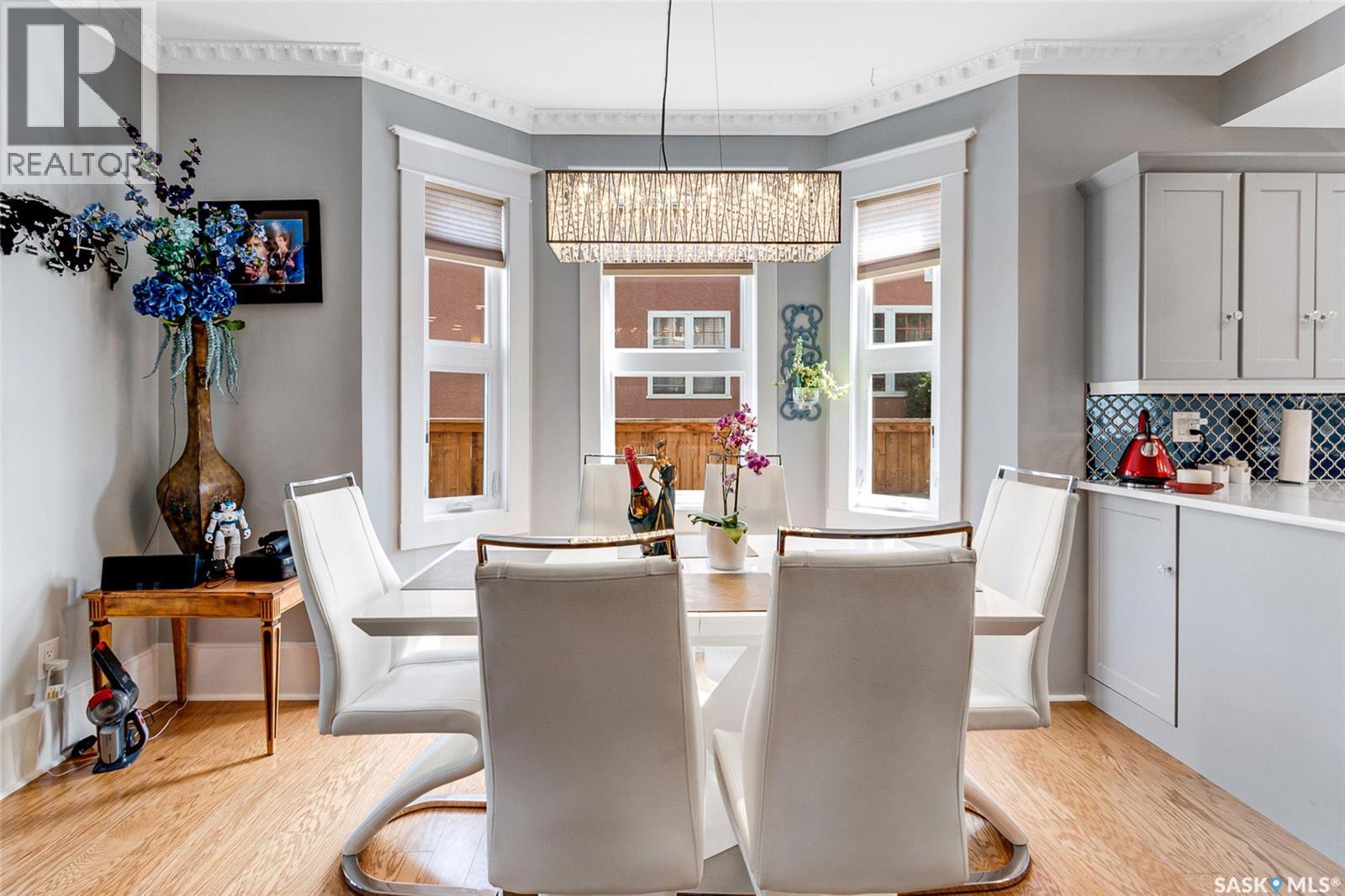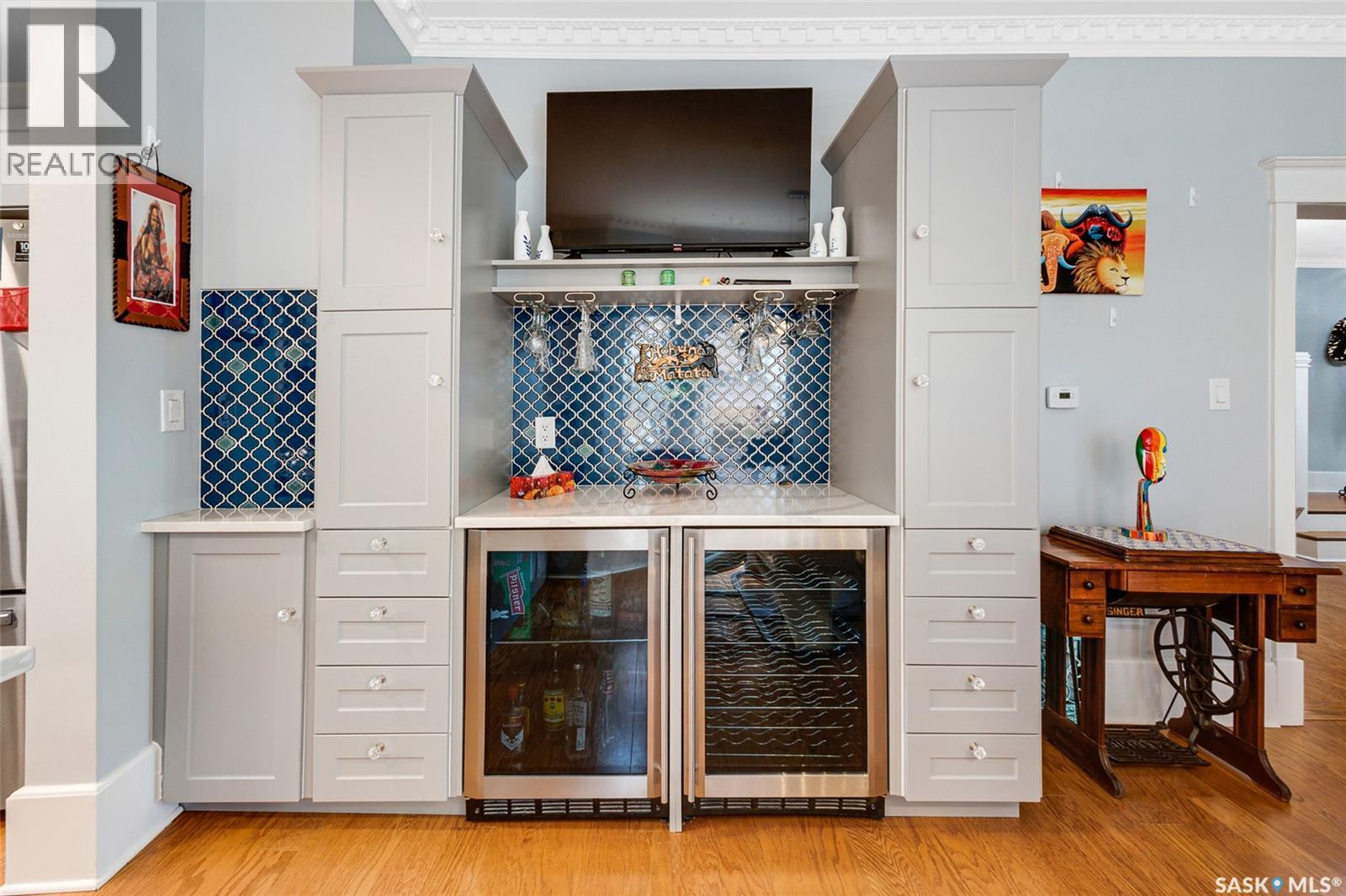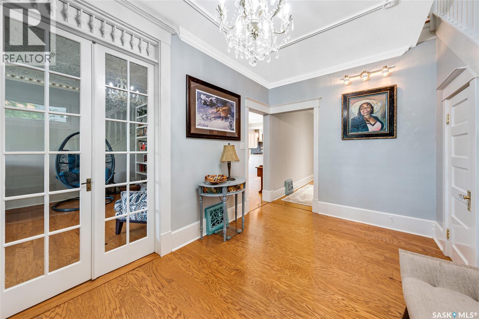 Just steps from the Saskatchewan River, tucked into the historic Nutana Neighbourhood, this Character 1911 home has been lovingly restored for clients who appreciate the history and location of this property. This spacious home has a completely renovated kitchen with quartz countertops, new cupboards and backsplash, under counter lighting, all new appliances, including a newer large wine and beer fridge and a nice open floorplan flowing through to the dining room and living room. An office space and main floor laundry are a great convenience on the main floor. Four- piece bathrooms on each of first two floors and half bath on third floor are convenient. Three large bedrooms on the second floor, one with a very large walk-in closet with window. (Could be used as a nursery.) One of the bedrooms on the second floor can also be used as a Sunroom. A new staircase leads to the third floor where the primary bedroom could be located. This room could also be used as a bonus room or very large office. Owner has replaced much of the crown molding to return this property to its original glory. There are South facing decks off the second and third floor as well as a back deck off the kitchen, also South facing. Most windows are new. Furnace, water heater and reverse osmosis recently changed. New paint everywhere and new engineered hardwood flooring make this is a turnkey property (Vinyl planking on the 3rd floor). Arches, tall baseboards, bay windows and glass doors complete the historic look of this home. This property has a completely fenced in backyard with board sidewalk leading to parking off the back alley. There is room for a garage. The owner has also created a small oasis of gardening boxes tucked around the back yard which is drenched in sunshine most of the day. Come and visit this beautifully renovated historic home, you’ll be glad you did. (id:34297)