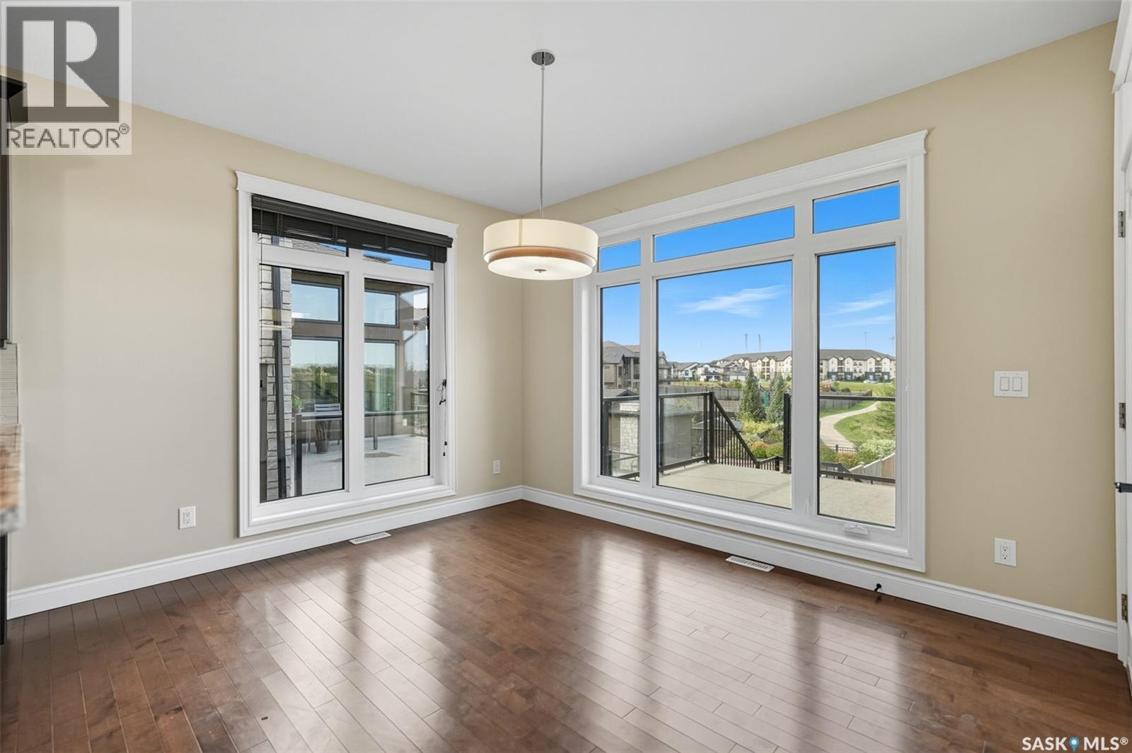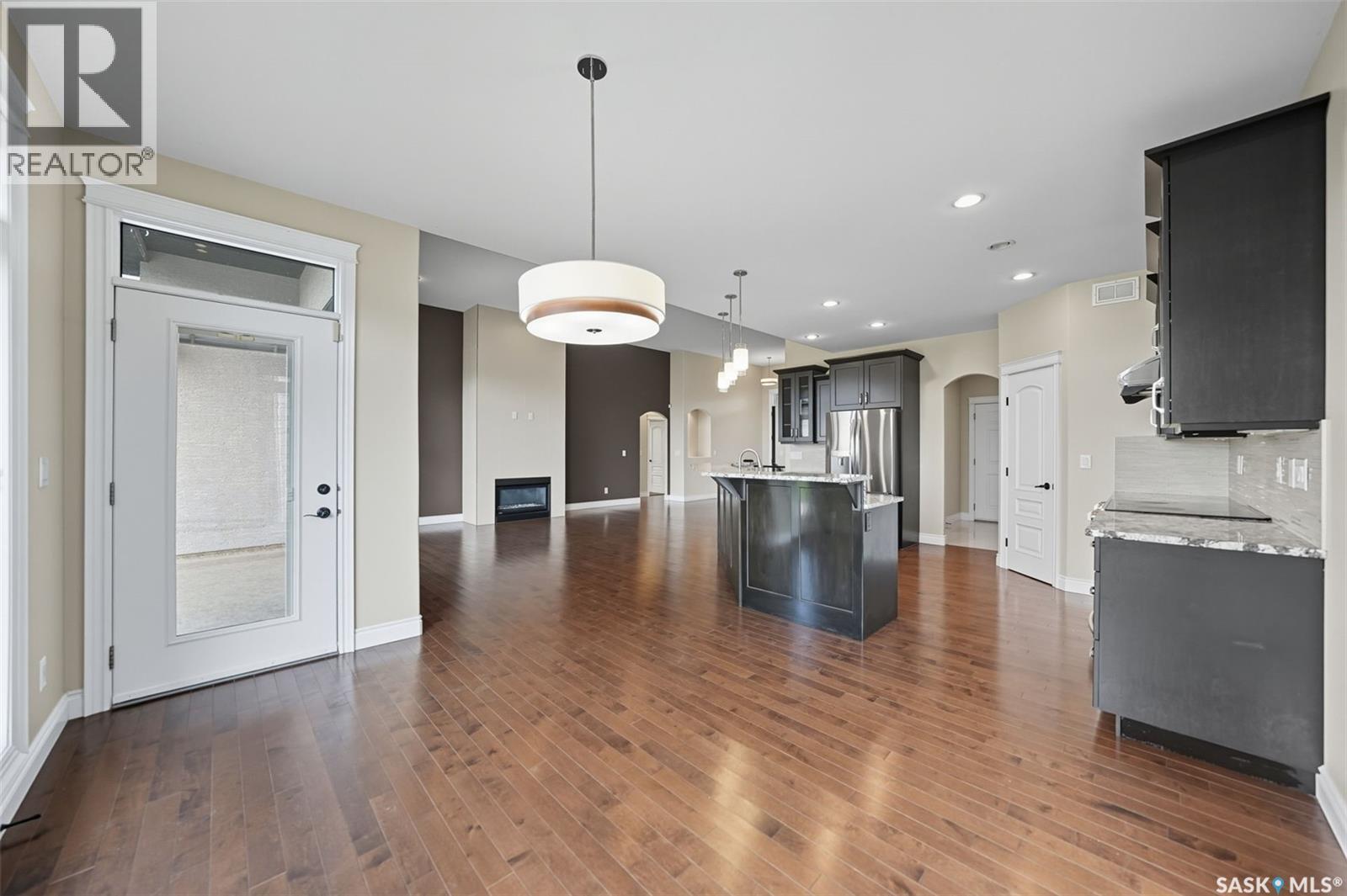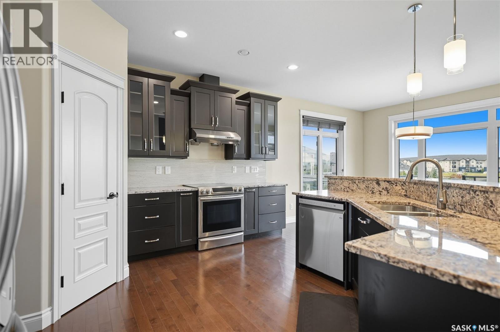 Welcome to 714 Ledingham Place, a rare find in a fantastic cul-de-sac location backing onto Hyde Park with breathtaking water views. Situated on a massive 9,559 sq. ft. lot with a sunny southwest-facing backyard, this D&S–built walkout bungalow offers over 3,600 sq. ft. of luxurious living space with top-quality finishes inside and out. The striking stone and stucco exterior, oversized driveway accommodating up to five vehicles, and impressive curb appeal set the tone. Inside, the main floor boasts soaring 12-ft ceilings, a spacious foyer with tile flooring, open-concept living with a tiled feature wall and gas fireplace, and a chef’s dream kitchen with abundant maple cabinetry, granite countertops, tiled backsplash, corner pantry, and a generous dining area overlooking the park and pond. Hardwood flooring flows throughout, complementing three large bedrooms, including a primary suite with walk-in closet and spa-like ensuite featuring dual sinks and a tiled shower. Main floor laundry adds convenience. The bright walkout basement expands the living space with a large games room, family room, office, two additional bedrooms with walk-in closets, a 5-piece bath with jetted tub, and durable laminate flooring. Outdoor living shines with a composite deck, glass railing, and stairs leading to the park-like yard with underground sprinklers on a timer. Additional upgrades include triple-pane windows, central vac, HRV, new central A/C (2025), dishwasher (2023), and fridge (2021). Close to schools, shopping, and all amenities, this home truly shows 10/10. (id:34297)