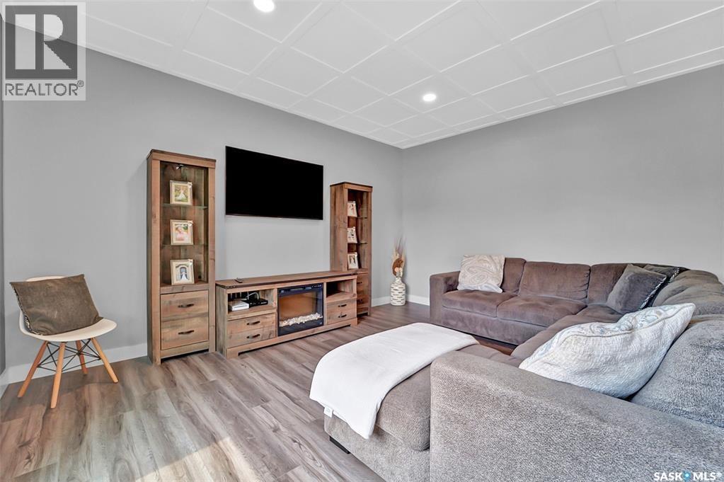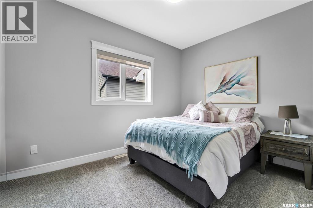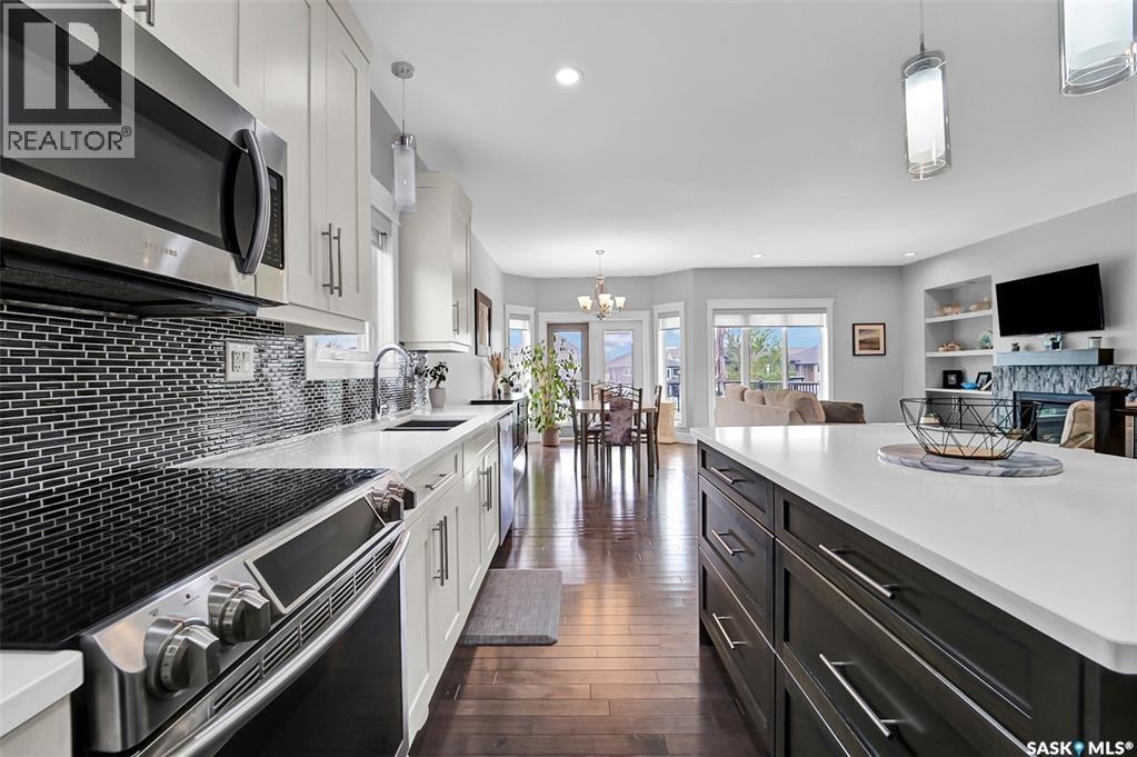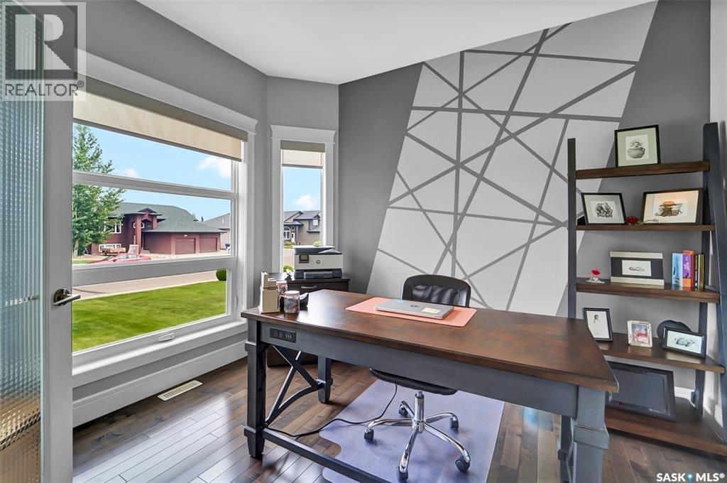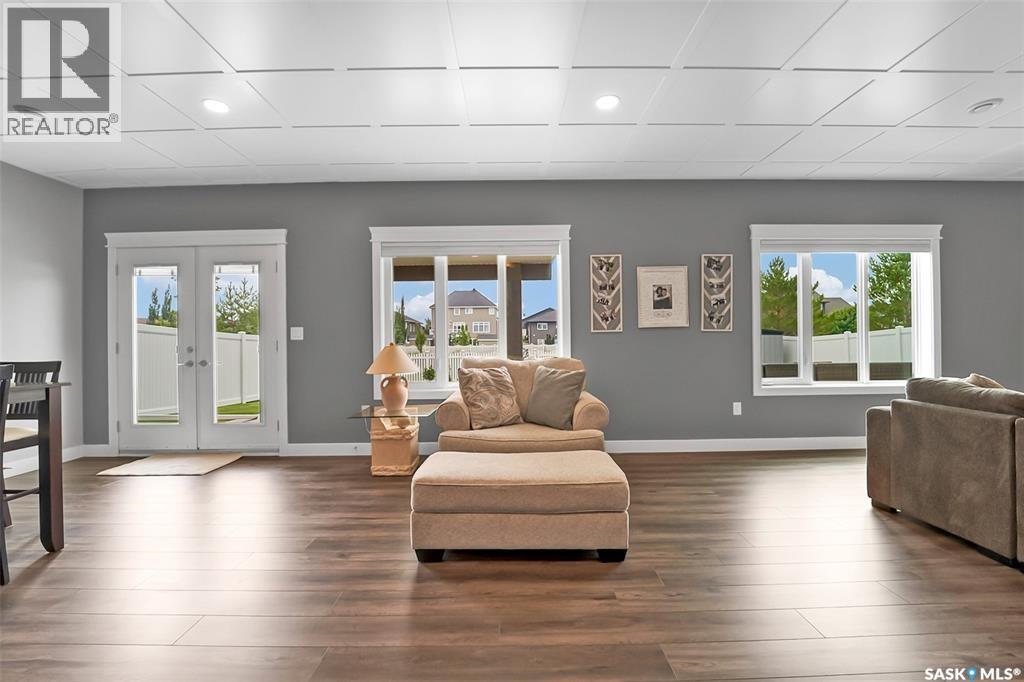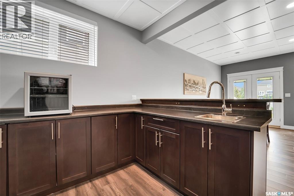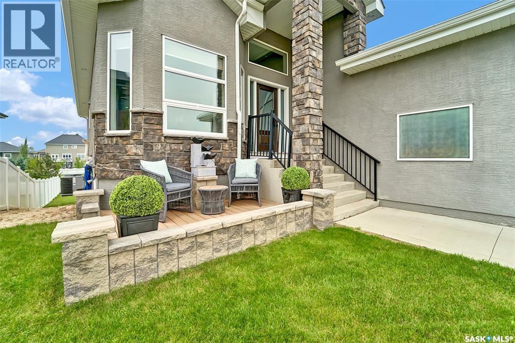 Welcome to this stunning walkout bungalow backing onto the park in Warman, where over $60,000 in recent upgrades have elevated this home into something truly special. From the moment you step inside, you’ll be impressed by the spacious layout, elegant finishes, and natural light throughout. The main floor features a grand front entrance, a high-end kitchen with an oversized island, and a warm, inviting living room with a gas fireplace. The large primary bedroom includes a luxurious five-piece ensuite, while a second bedroom, dedicated office space, main floor laundry, and a breathtaking deck overlooking the park complete the level. The walkout basement offers a spacious family room, games area with a bar, two generous bedrooms, and a full bathroom. The beautifully landscaped backyard includes a lower patio, stonework, and two storage sheds. A heated double garage with 10-foot ceilings adds practicality to the home’s charm. Upgrades include luxury vinyl plank flooring in the basement, upgraded carpet on the main floor, UV/heat protectant tint On the windows in the main floor living room,right side patio door as well as the basement family room right side, a custom front door, refreshed master bath with new taps and paint, front and lower decks, brick flowerbeds, and custom blinds in the basement. With its thoughtful design, serene park views, and turn-key updates, this home is the perfect blend of comfort and elegance ready for you to enjoy. This beautiful home is close to the schools, Warman community centre, and all other amenities. (id:34297)