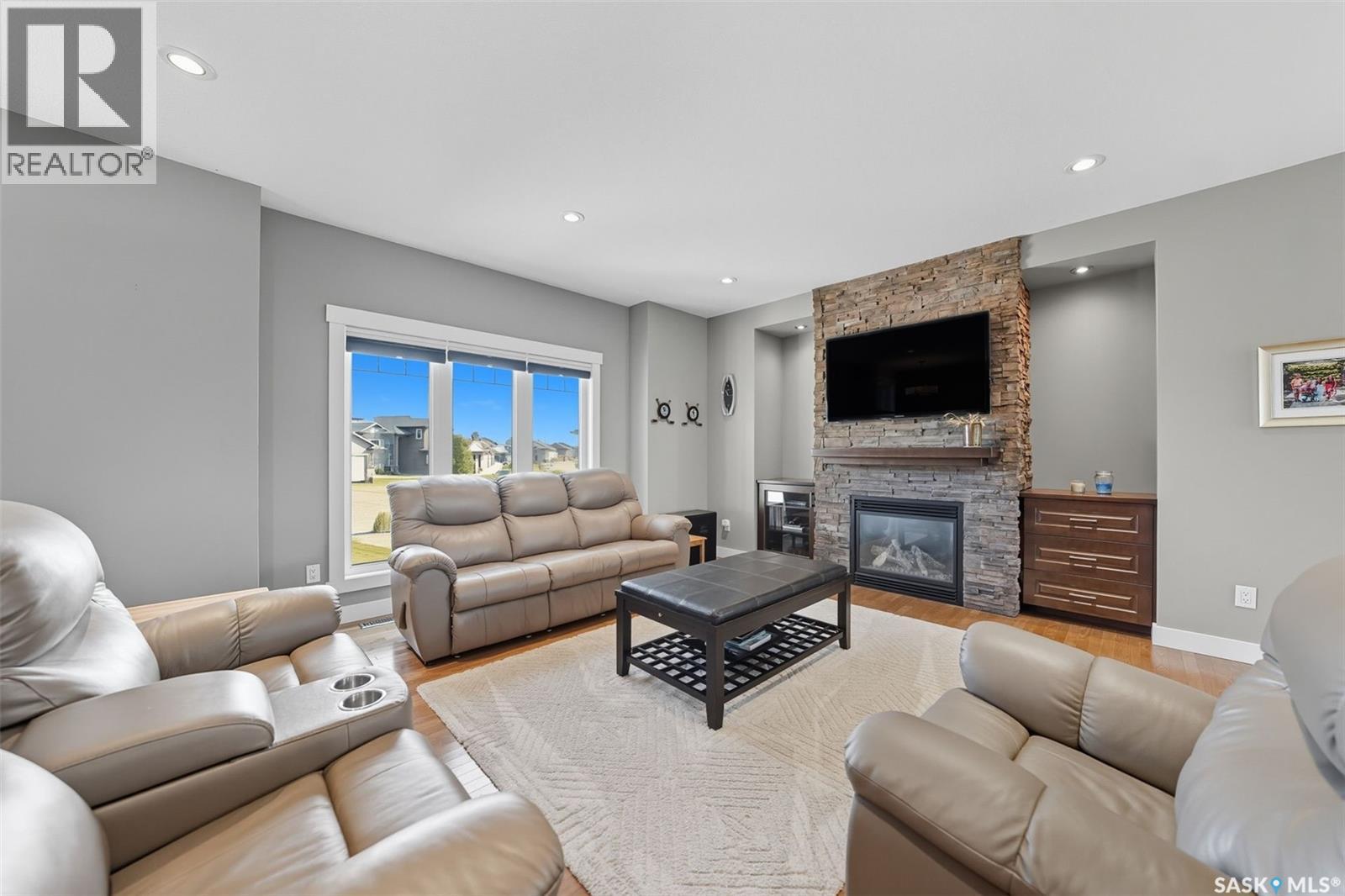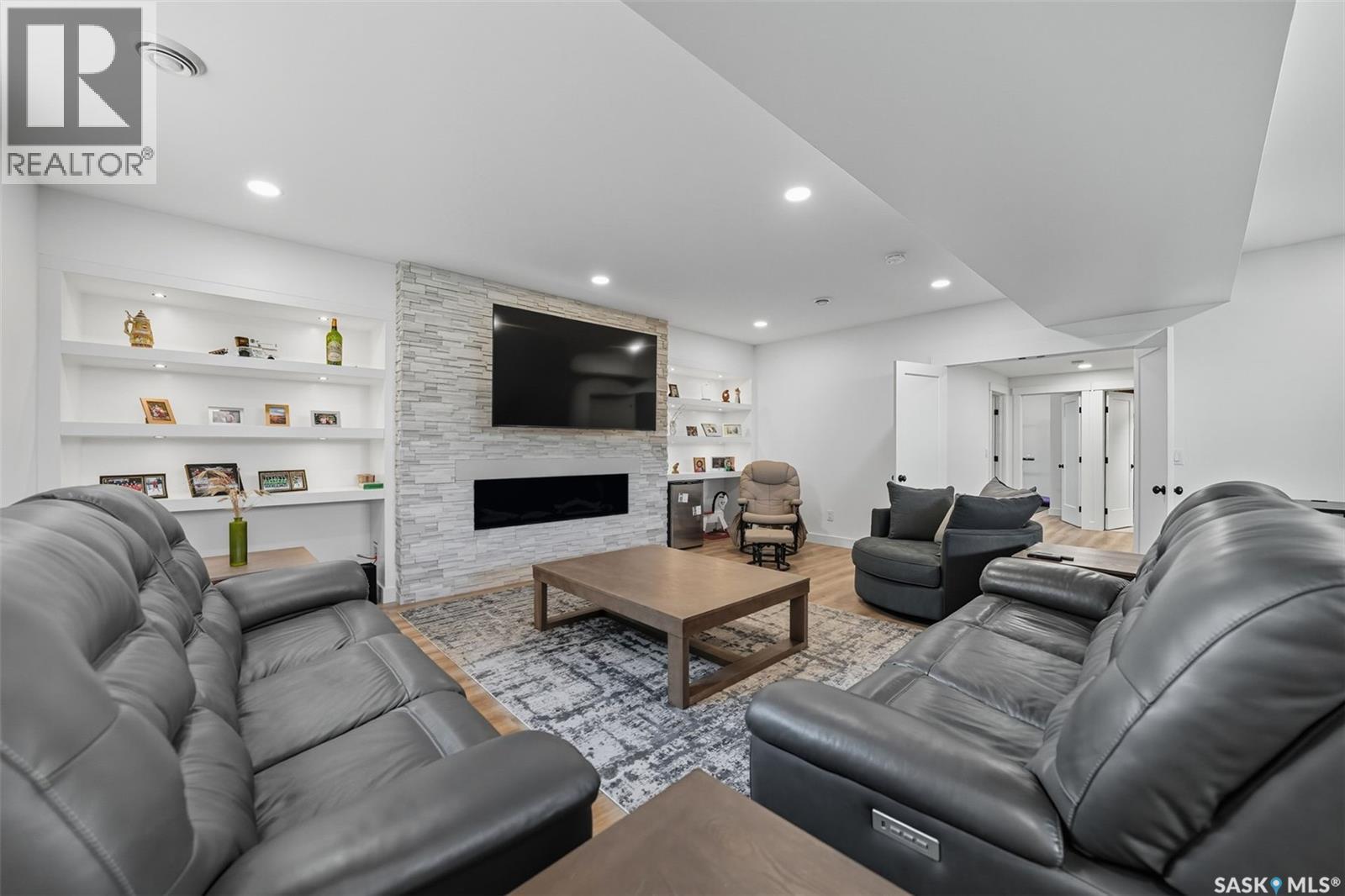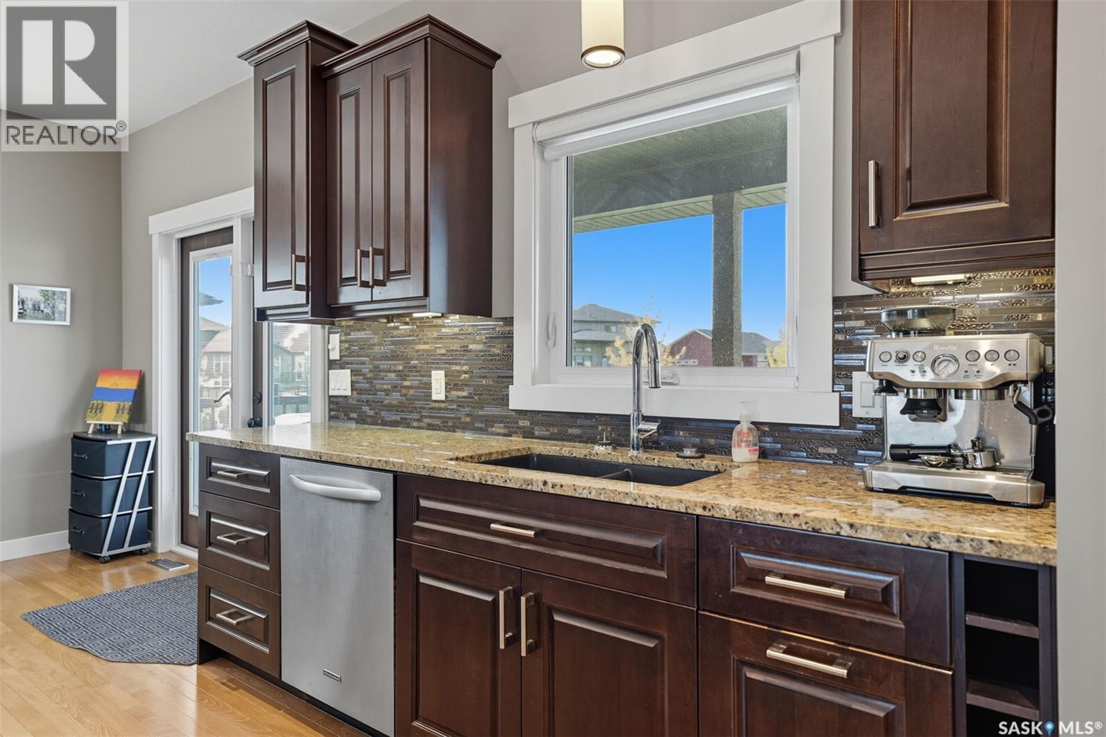 OPEN HOUSE SATURDAY 1-3 PM. Nestled in the heart of Rosewood, this executive bungalow offers a perfect balance of comfort, functionality, and upscale finishes, backing southwest onto walking trails and greenspace. With an expansive open layout, five spacious bedrooms (3 up, 2 down) and three bathrooms, the home is ideal for family living and entertaining. The main floor showcases hardwood and tile flooring with carpet in the bedrooms, a living room with feature gas fireplace and built-in speakers, and a gourmet kitchen with granite countertops, tile backsplash, under-cabinet lighting, soft-close cabinetry with full-extension drawers, and stainless steel appliances. A walk-in closet off the foyer adds everyday convenience. The primary suite is a true retreat, complete with blackout blinds, a large walk-in closet, and a spa-inspired five-piece ensuite with in-floor heat, jetted tub, dual sinks, tiled shower with glass door, and built-in speakers. Two additional bedrooms, a full bathroom, and a laundry room with built-in cabinetry and sink complete the main level. The fully finished basement offers two more large bedrooms (one currently a gym), a full bathroom with quartz vanity and steam shower, plus an inviting family and games area with feature wall and gas fireplace. The mechanical room provides excellent storage and houses an on-demand water heater, humidifier, and central A/C. Every closet features custom MDF built-ins for exceptional organization. Outdoor living is just as appealing with a covered deck and built-in speakers, large storage shed, and easy access to trails. The attached heated garage measures 26' x 24'/26'. Thoughtfully designed and meticulously maintained, this home is perfectly located with easy access to parks and all area amenities. (id:34297)
