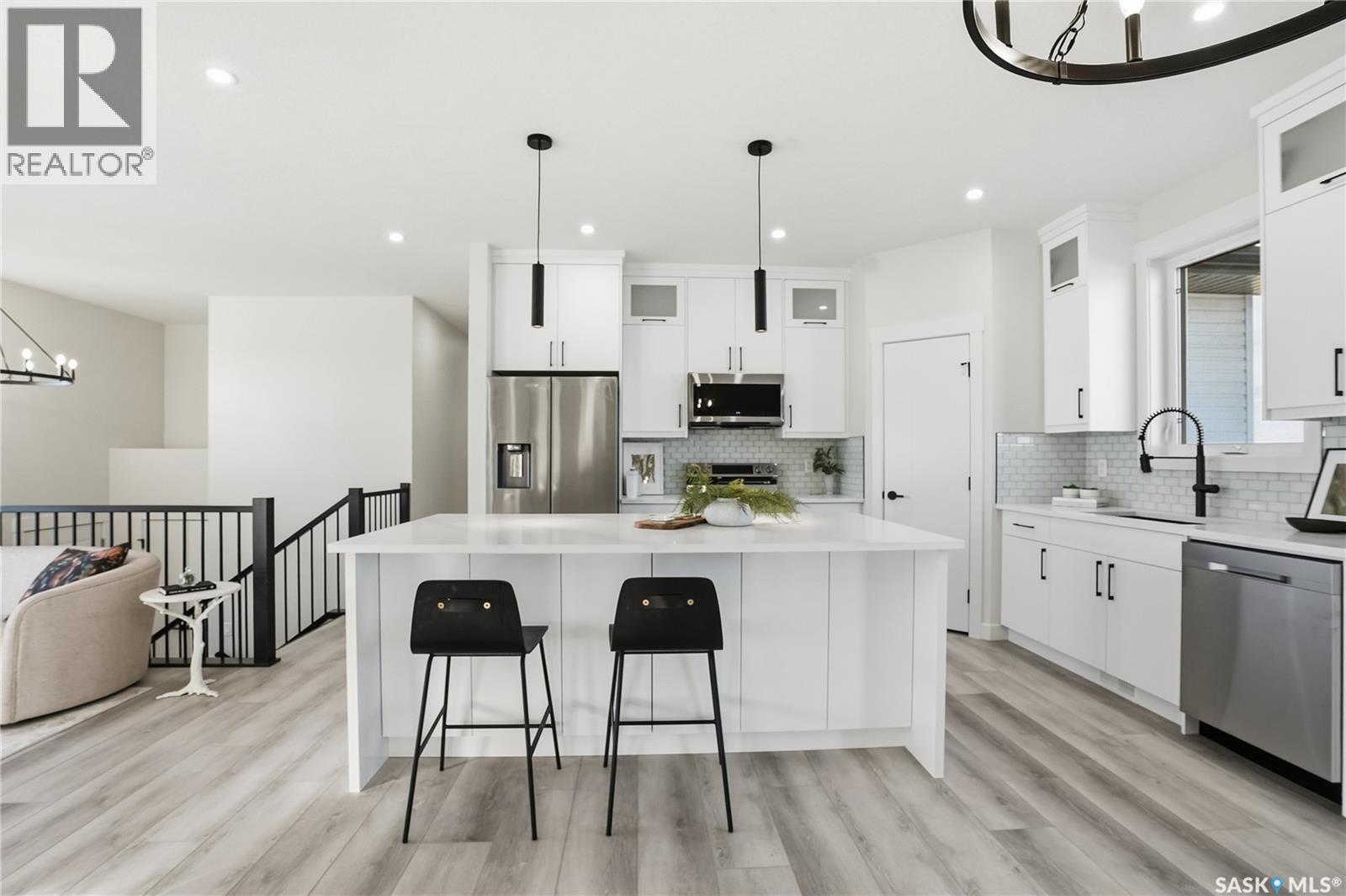 Experience the perfect blend of modern design and everyday functionality in this brand-new 1430 SQFT home built by Taj Homes. This home comes with a fully developed basement featuring two bedrooms, one bathroom, mini bar and an electric fireplace finished with shiplap. On the main floor, the kitchen features floor to ceiling cabinetry, quartz countertops, and a full set of stainless steel appliances, seamlessly connecting to the open concept living and dining areas with an electric fireplace and oversized windows. The home offers three bedrooms and three bathrooms in total, including a primary suite with a custom feature wall, walk in closet and 5 piece ensuite complete with a tiled/glass walk in shower and tiled tub surround and his/her vanities. Main Floor bathrooms include full height tiled surrounds with Delta fixtures and quartz countertops. Built in shelving is provided in the pantry and bedroom closets, along with a convenient main floor laundry room. The oversized heated, insulated and drywalled double attached garage measures 25 x 26 (two overhead doors 10ft and 9ft) and includes a concrete driveway. Additional features include All Weather triple pane windows, on demand water heater and central A/C. The rear deck is included and finished with treated wood planks and aluminum railing, along with partial fenced yard. Backed by Progressive New Home Warranty with a guaranteed possession date. Pictures are from a previous build, finishes are similar. (id:34297)
